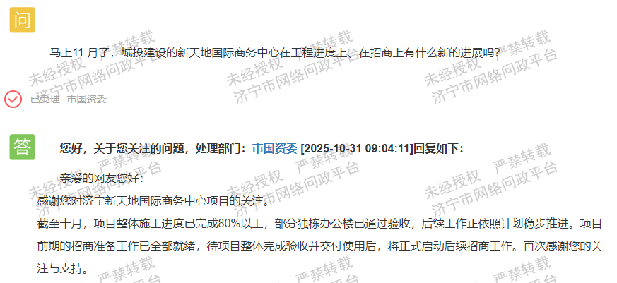 近日,济宁名城事小编从相关渠道获悉,有网友在济宁市网络问政平台就新天地国际商务中心的进展情况发起询问。该网友提到,眼看着11月即将来临,对于由城投建设的新天地国际商务中心,在工程进度以及招商方面是否有新的动态?
