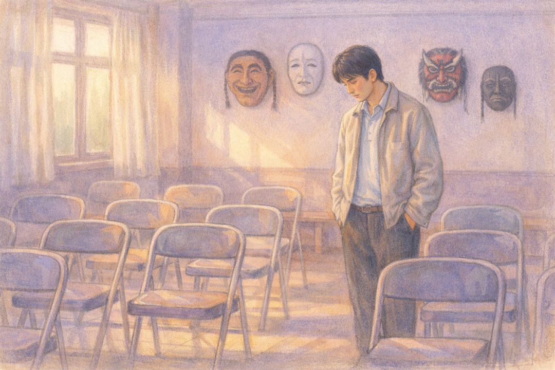他跳完一段,摘下面具,瞅着镜子里的自个儿, 他的头发白,脸上满是皱纹,脖子上还有面具勒出的印子,
