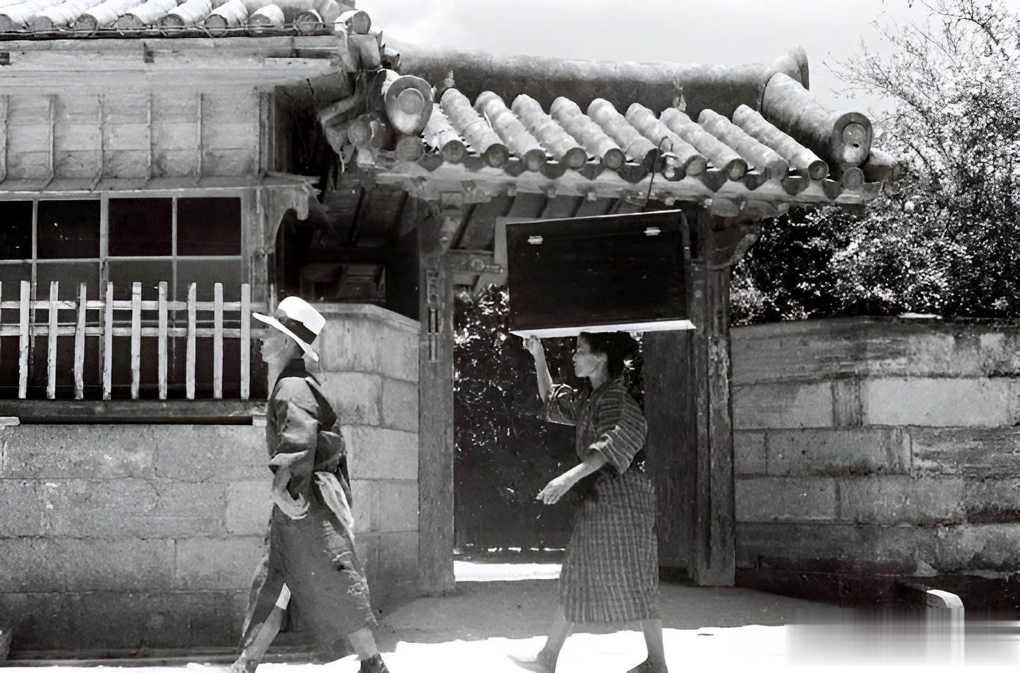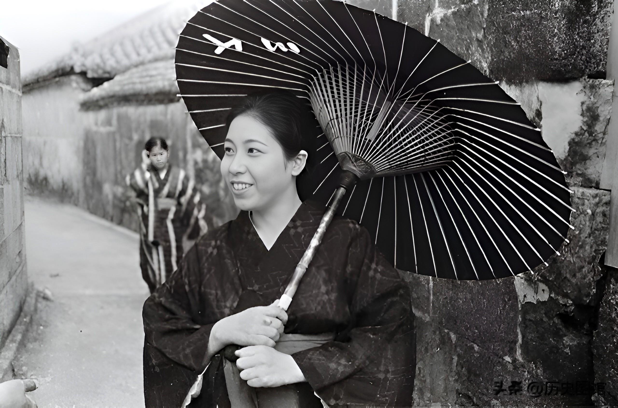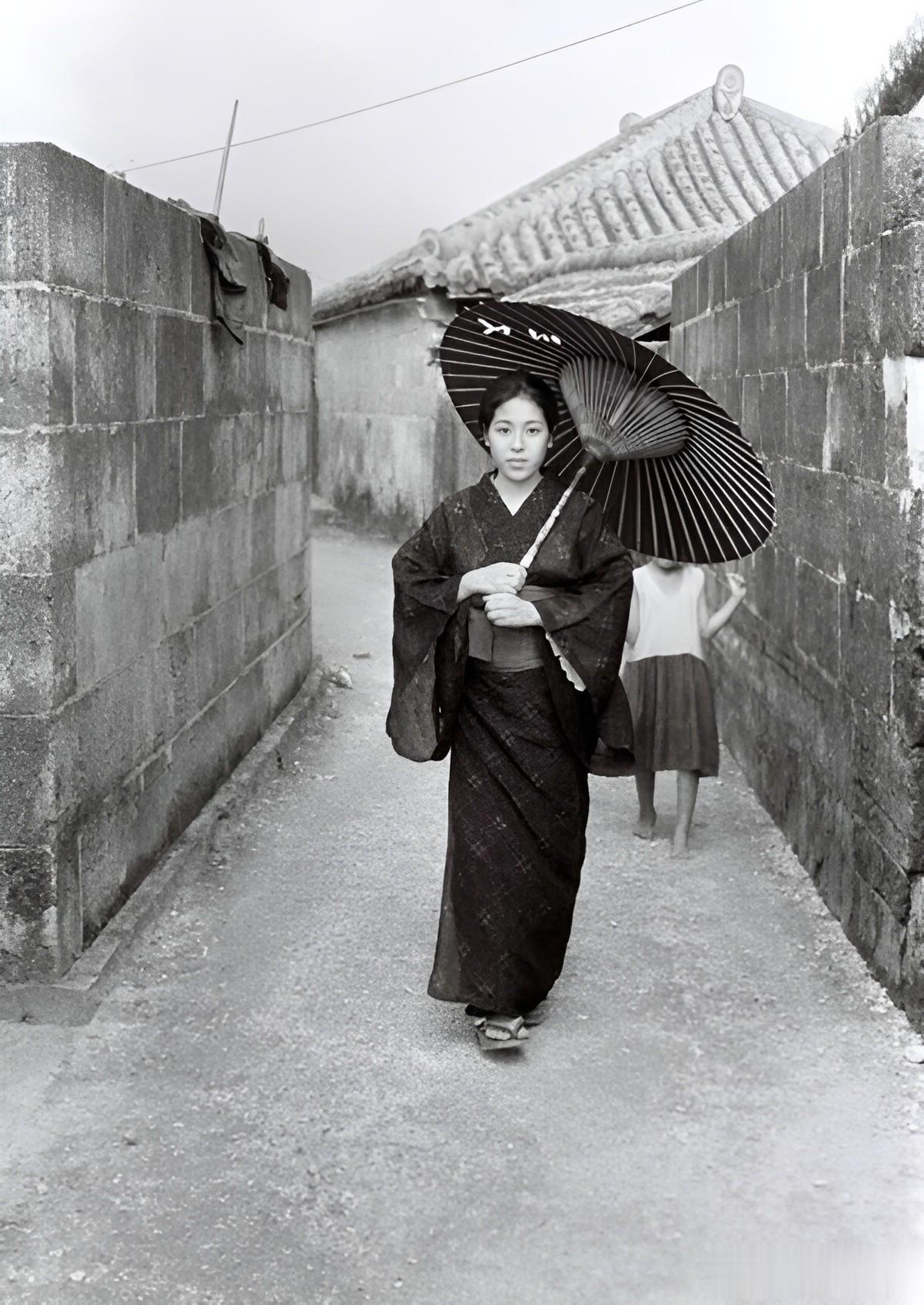 1935年,一名身穿和服的日本女子,打着伞从小巷子里走过。在她身后跟着一个光着脚的琉球小女孩。
