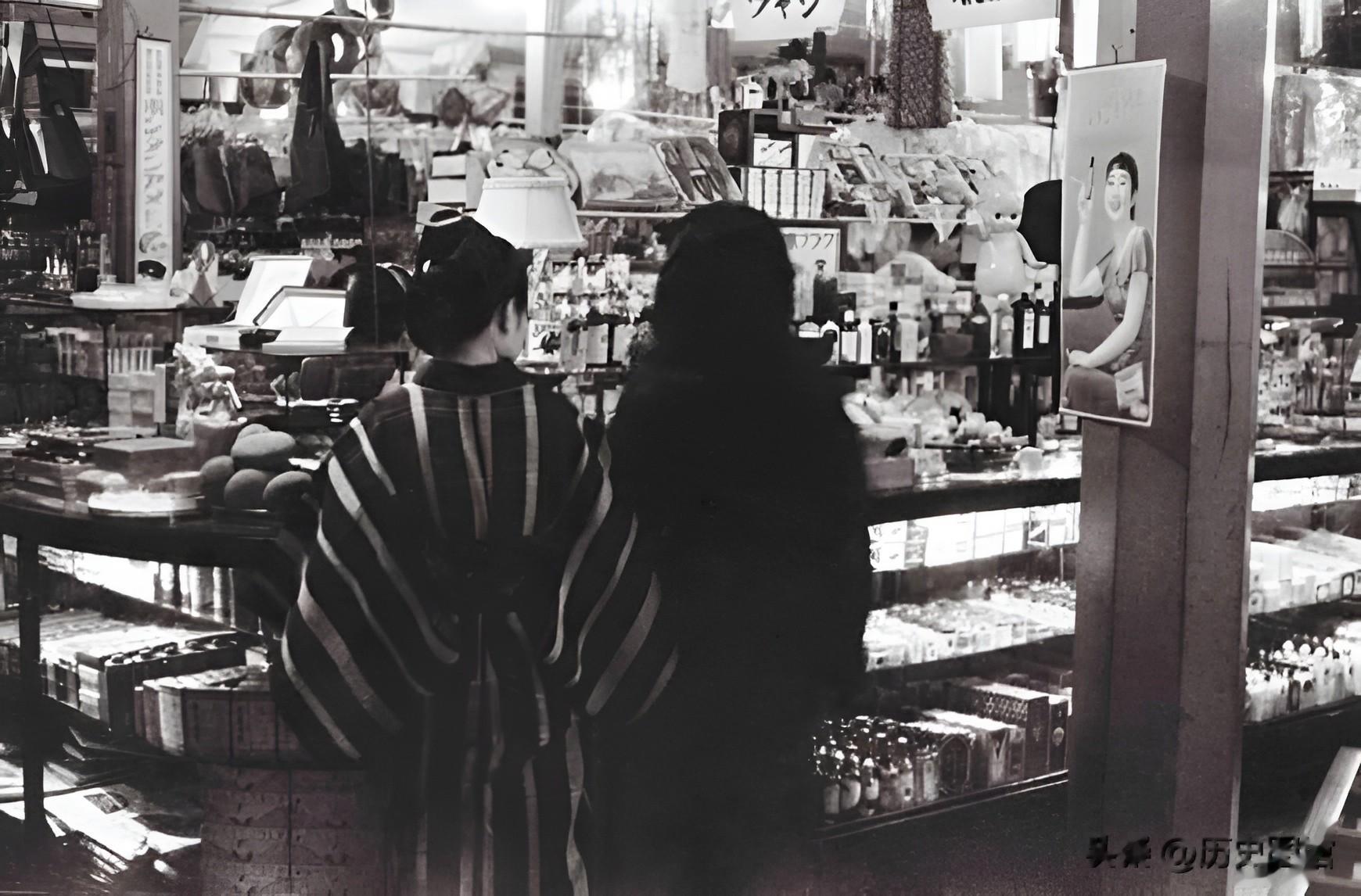 这张照片,拍摄于那霸。在一家商店里,两个琉球女子正在挑选商品。柜台里和货架上的商品琳琅满目。