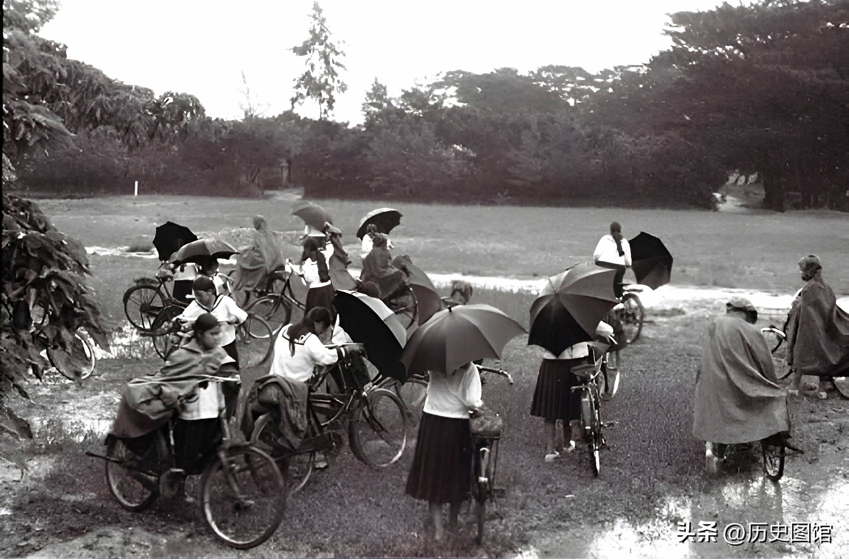 县立第三女校的学生们放学了,突然下起了大雨。女生们慌忙打伞穿雨衣,骑着自行车往家赶。照片拍摄于1935年。
