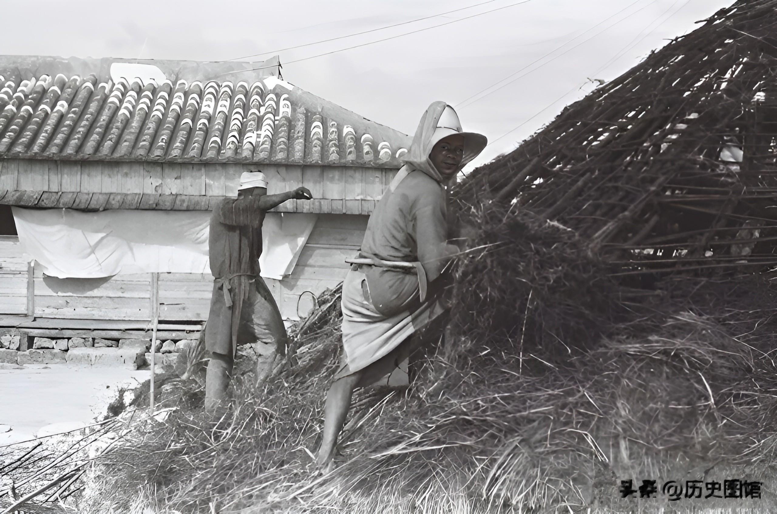 30年代,两名琉球人正在修建一栋草房。房子的框架已经搭好,正在往上面加盖稻草。这间房子很可能是用来当仓库用的。