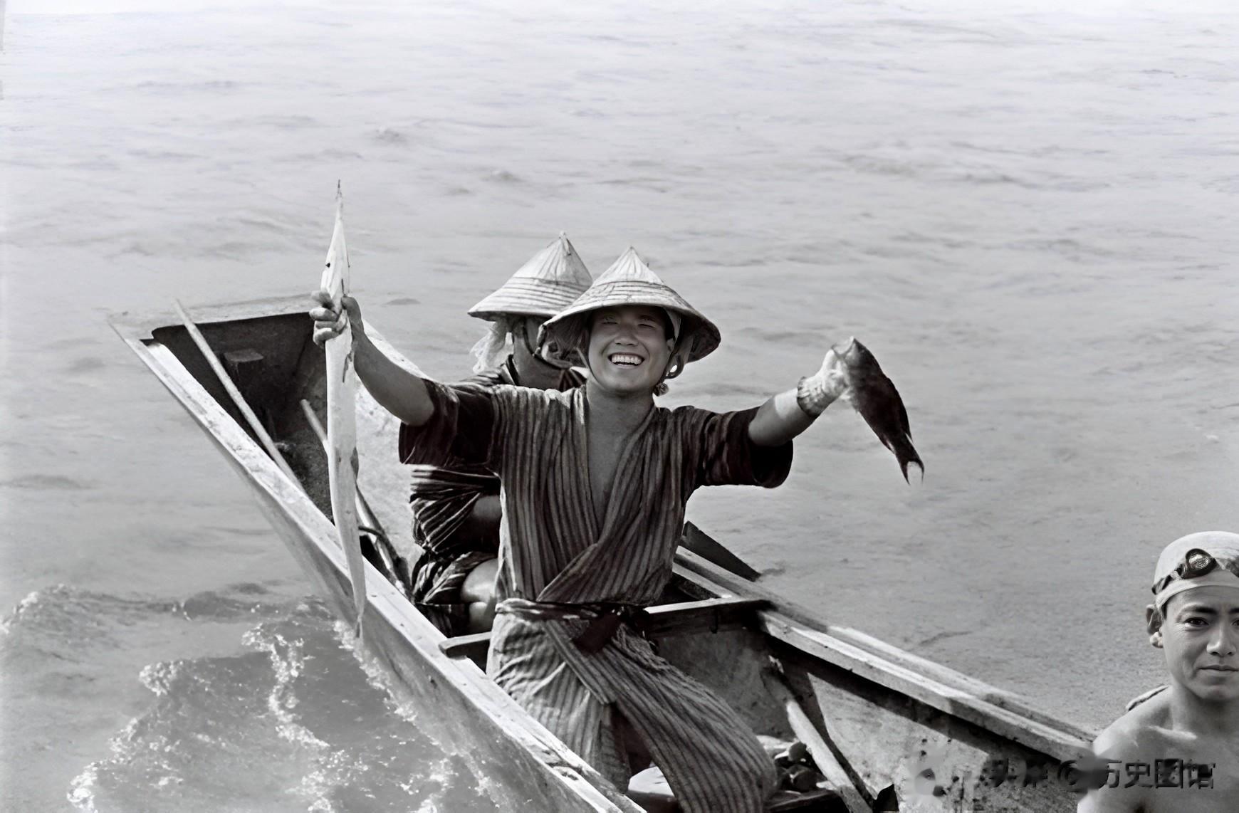 当地几个年轻人,坐着渔船在海里打渔。琉球渔业资源丰富,捕鱼业也是当地的支柱产业。戴斗笠的男子手里抓着两条鱼,脸上乐开了花。