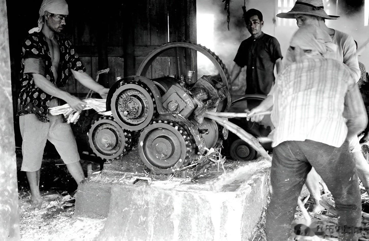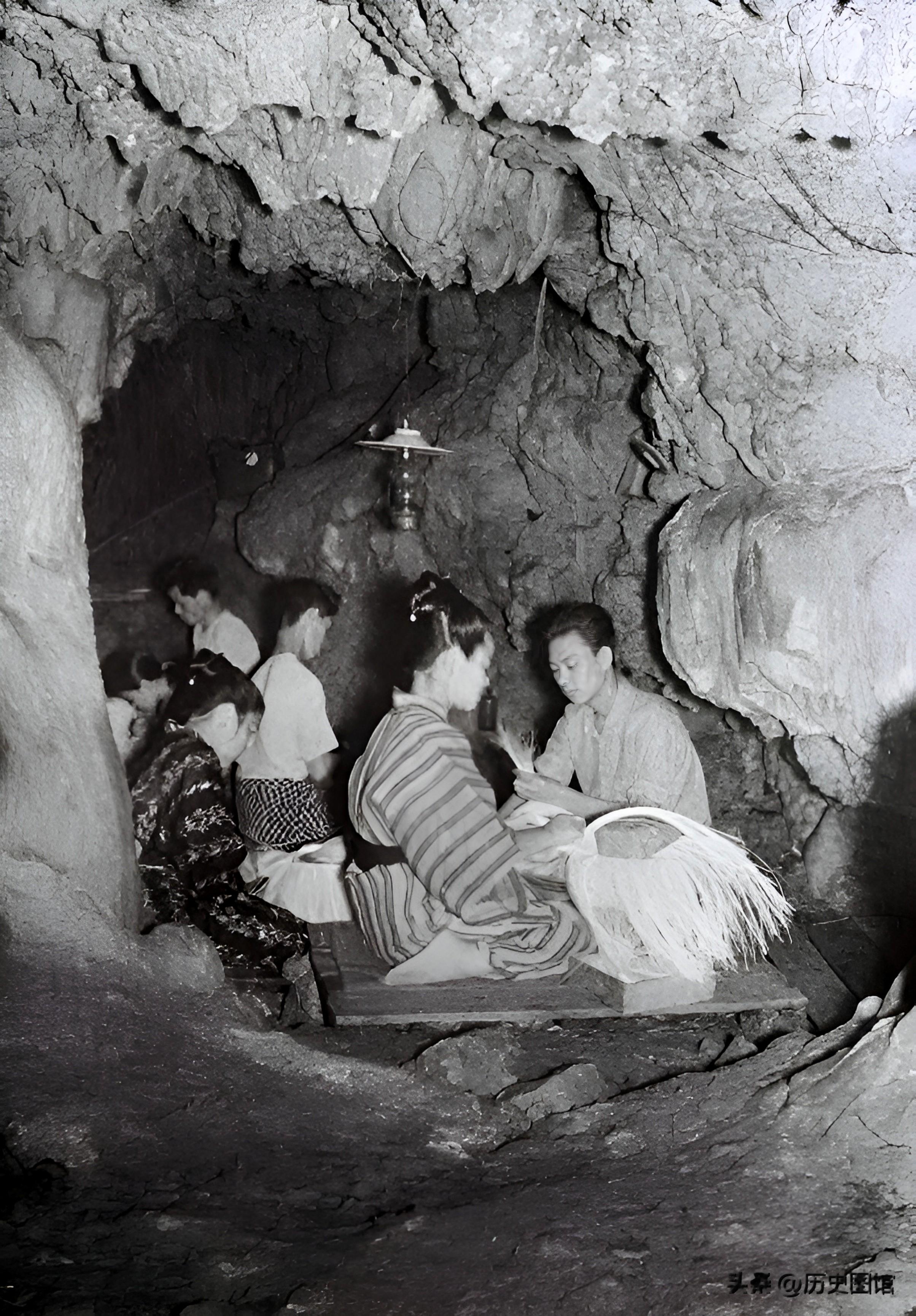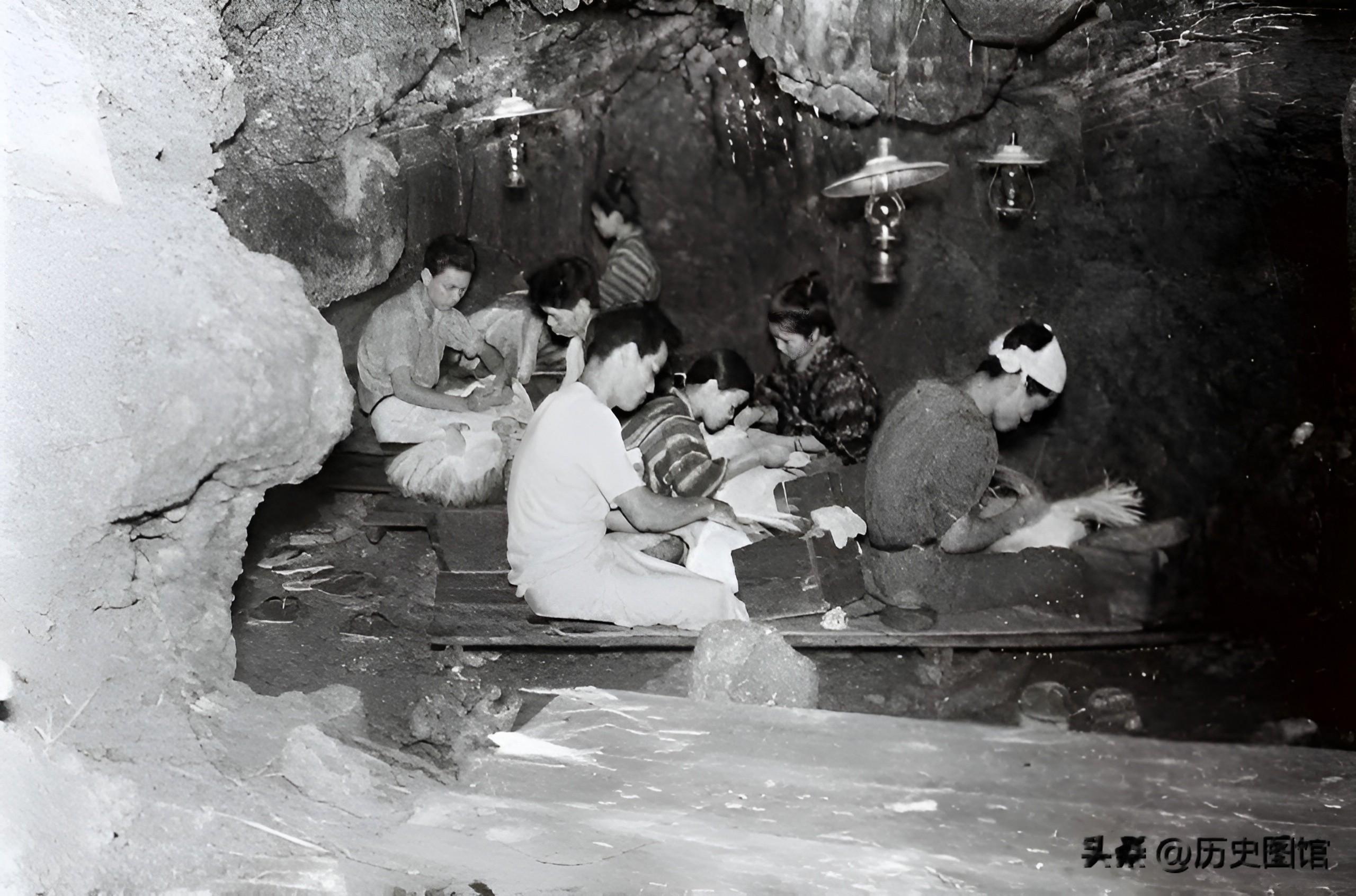 30年代,琉球一个手工作坊居然设在山洞里。几名女工人坐在木板上,头顶悬挂着汽灯。你能看出他们制作的是什么吗。