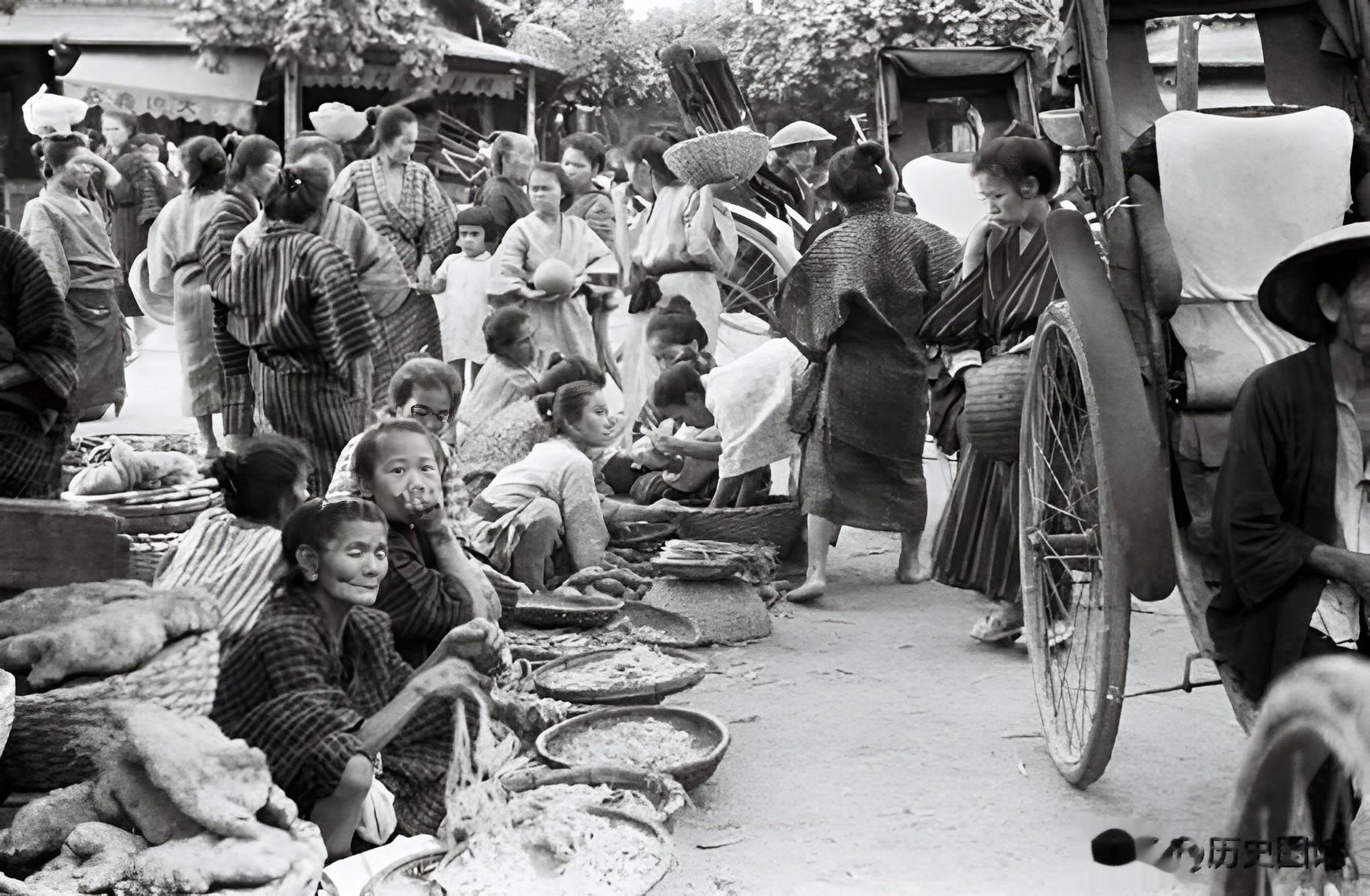 这是当地一个露天集市,不少小贩在路边摆地摊,看上去挺热闹的。路边还能见到黄包车夫坐在车上等生意。人们脸上的笑容很朴素,生活很朴实。