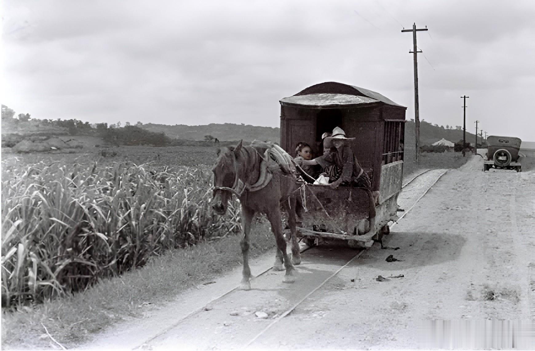 这是一种很奇特的交通工具——有轨马车。路上铺有很窄的铁轨,马拉着车厢前进。与不远行驶的汽车相比,这种比较落后的交通工具已经跟不上时代的步伐。