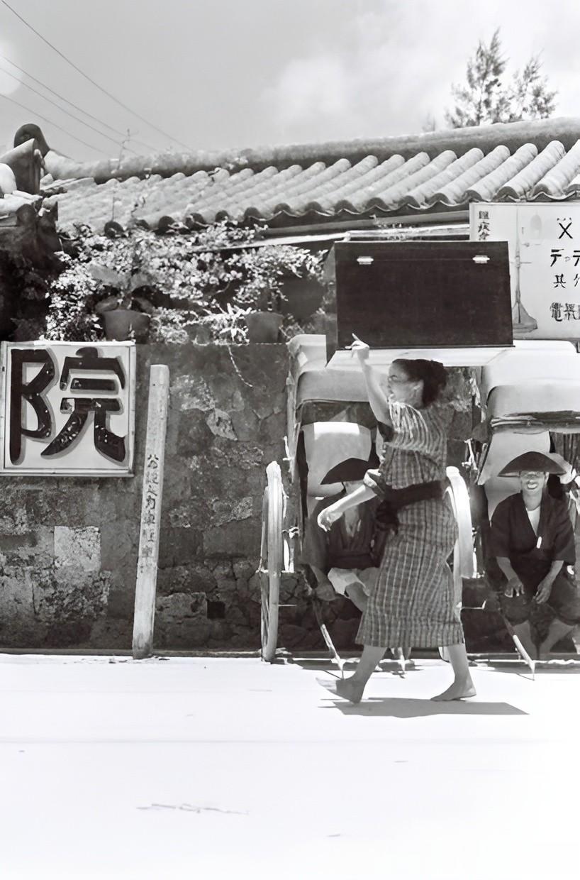 摄影师拍下了第二张照片,头上顶着箱子的女子,从几名在路边等生意的黄包车夫前经过。她身上穿的是琉球王国时代流行的服装。