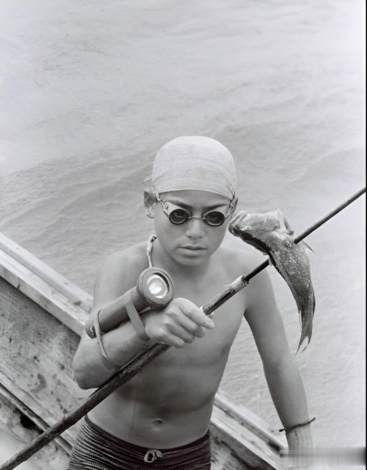 琉球的年轻人,个个都是捕鱼能手。照片中这名男子戴着潜水镜和手电筒,自潜入水中用标枪捕获一条海鱼。