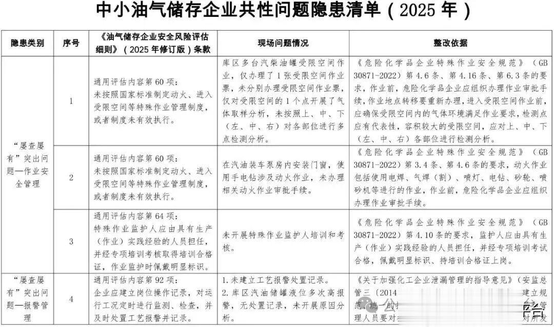 该清单的落地,能推动中小油气储存企业针对性解决长期存在的侥幸作业、隐患整改流于形式等问题,为油气储存领域安全生产筑牢防线。