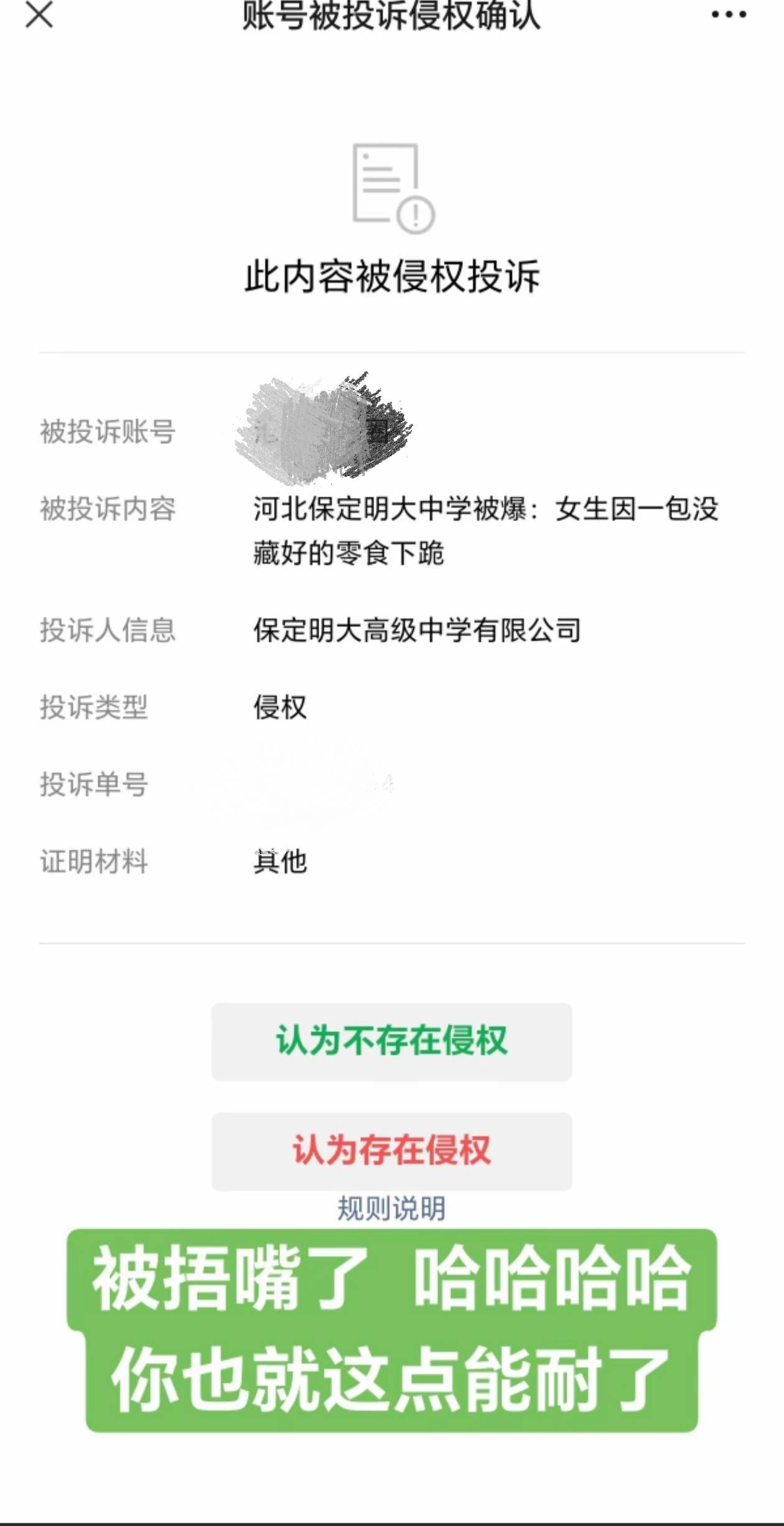 不过,有网友晒出后台截图称,自己的自媒体号转发相关内容,已经被举报“侵权”而“捂嘴”。