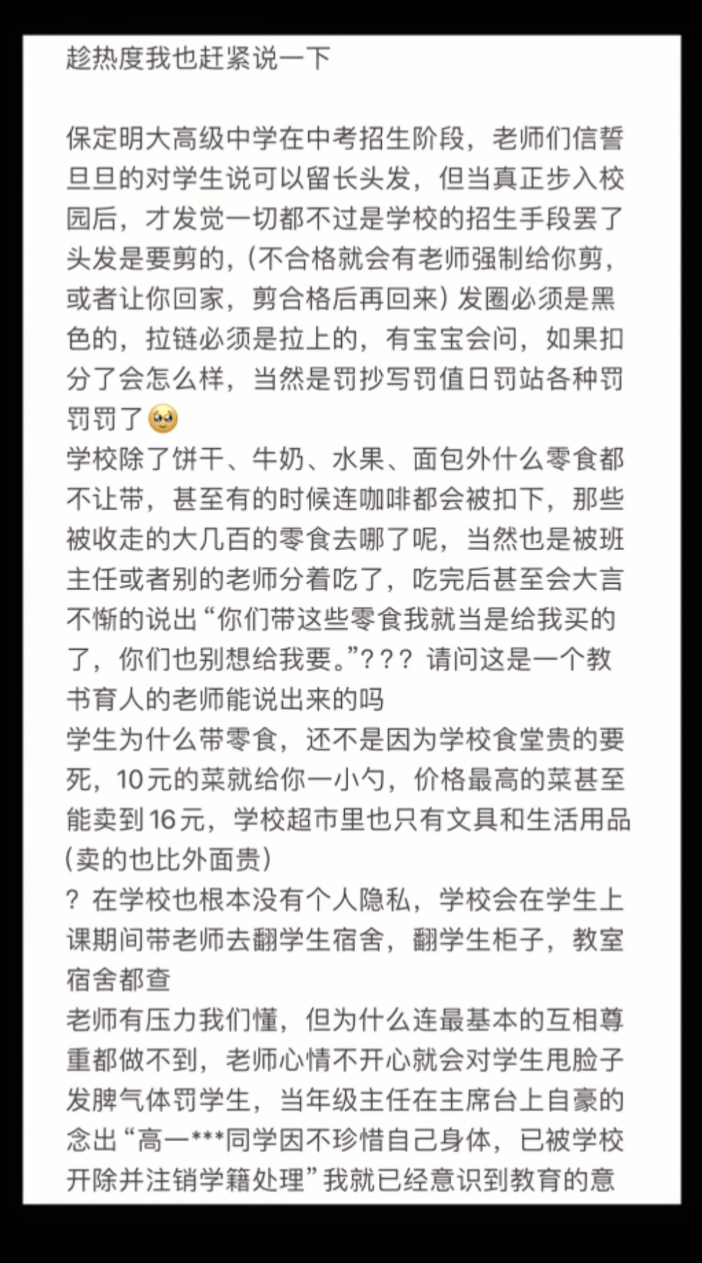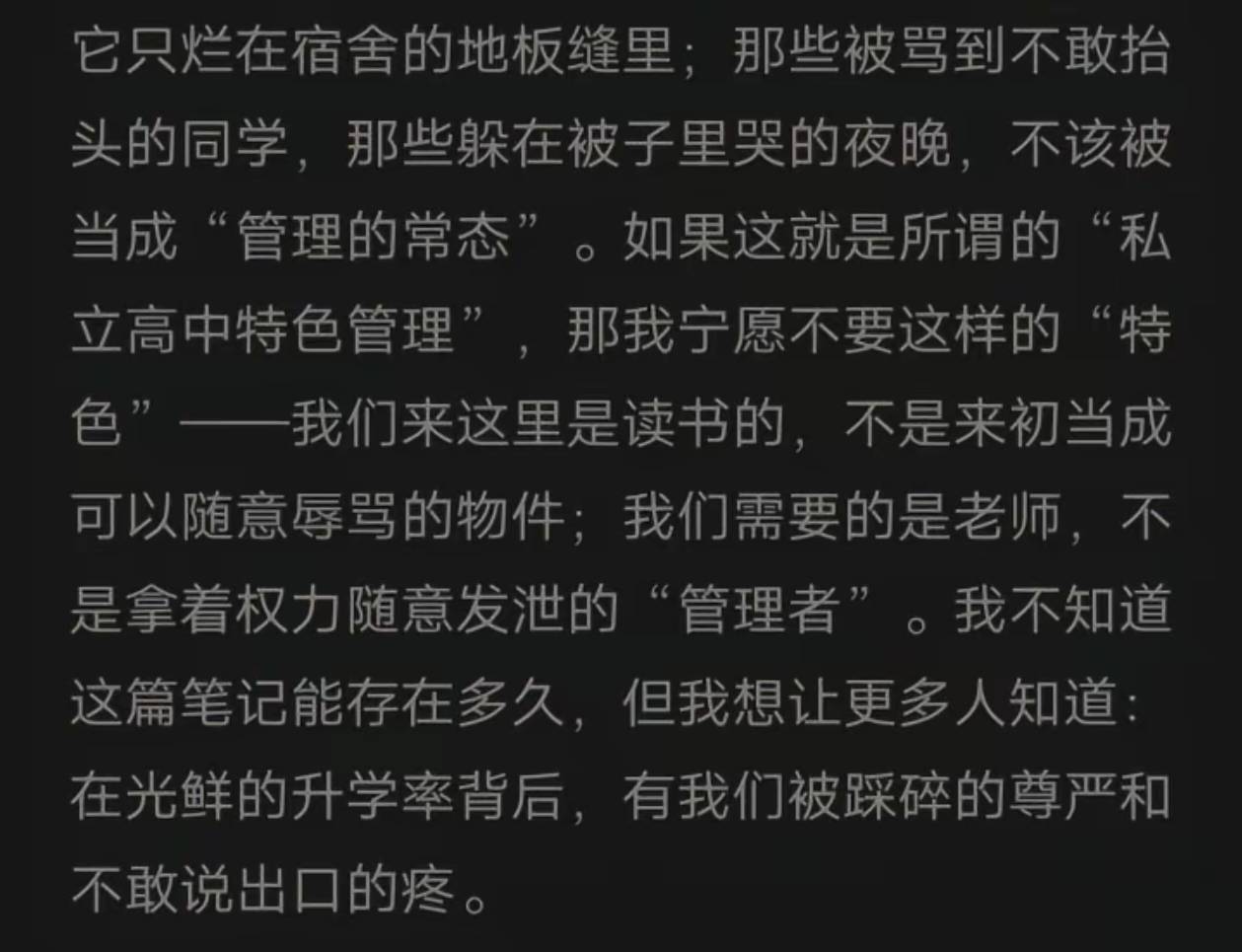 文中还提到,学校为何只要成绩,不关注未成年人的心理健康和个人权利:“学校总说‘严管出成绩’,可没人告诉我们,‘严管’的边界是把学生逼到放弃尊严吗?”“如果这就是所谓的“私立高中特色管理”,那我宁愿不要这样的‘特色’”。
