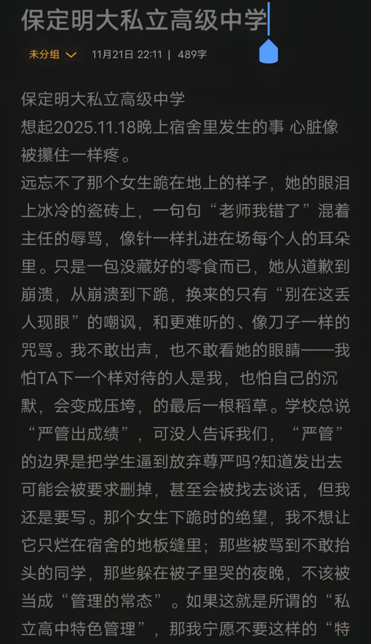 该文称,事件发生在2025年11月18日晚宿舍内。“那个女生跪在地上”,“一句句‘老师我错了’混着主任的辱骂,像针一样扎进在场每个人的耳朵里。”