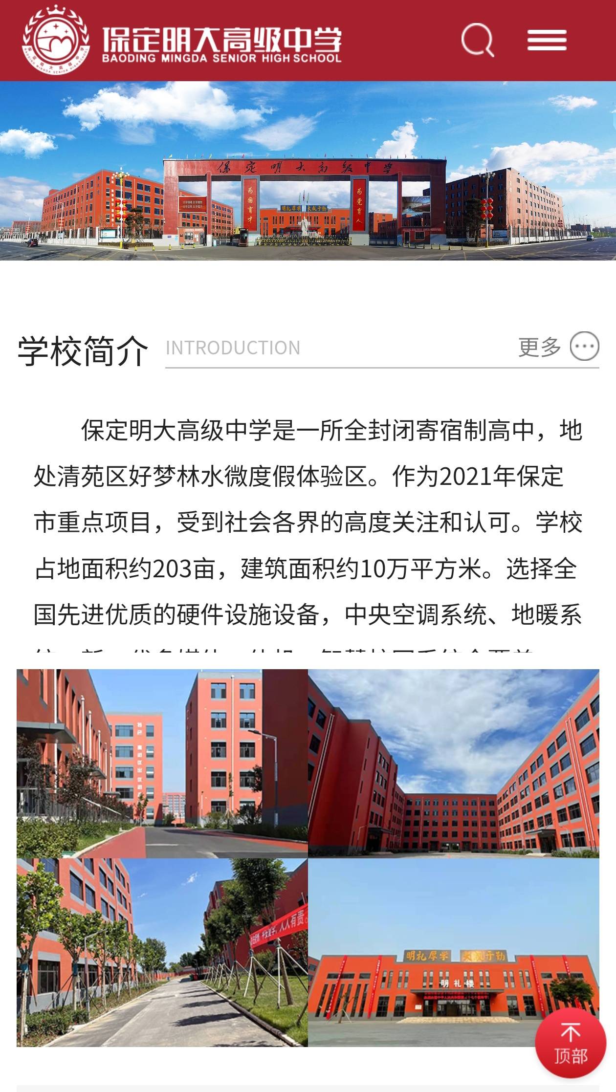 据官方网站显示,保定明大高级中学是一所全封闭寄宿制高中,地处清苑区好梦林水微度假体验区。学校成立于2021年,是2021年保定市重点项目。