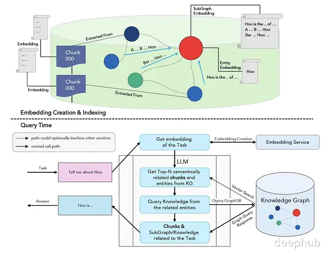 传统RAG的流程清晰:对文档分块,将分块嵌入向量数据库,查询时检索最相关的top-k分块,作为上下文传递给LLM,生成回答。