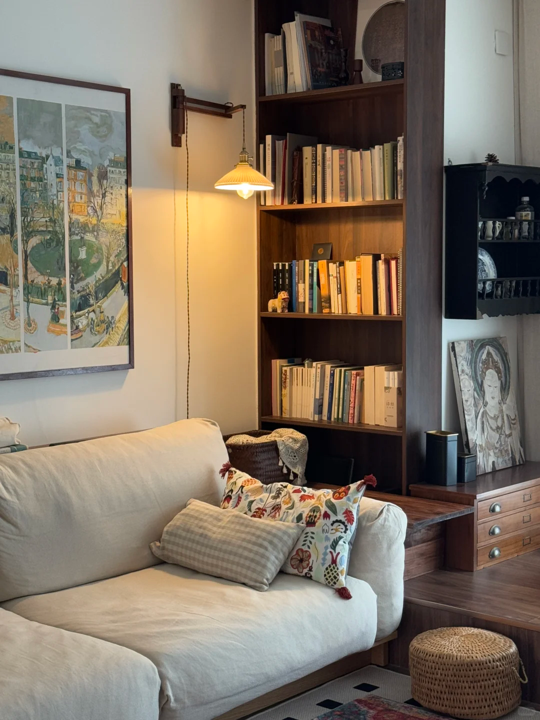 网友@不然 的分享:老房子的这个位置总是被忽略,摆放一个孤单的边几,说真的没什么太大用处,我就直接爆改了一下,做了地台、墙柜,作为书柜,我觉得这样才是生活。
