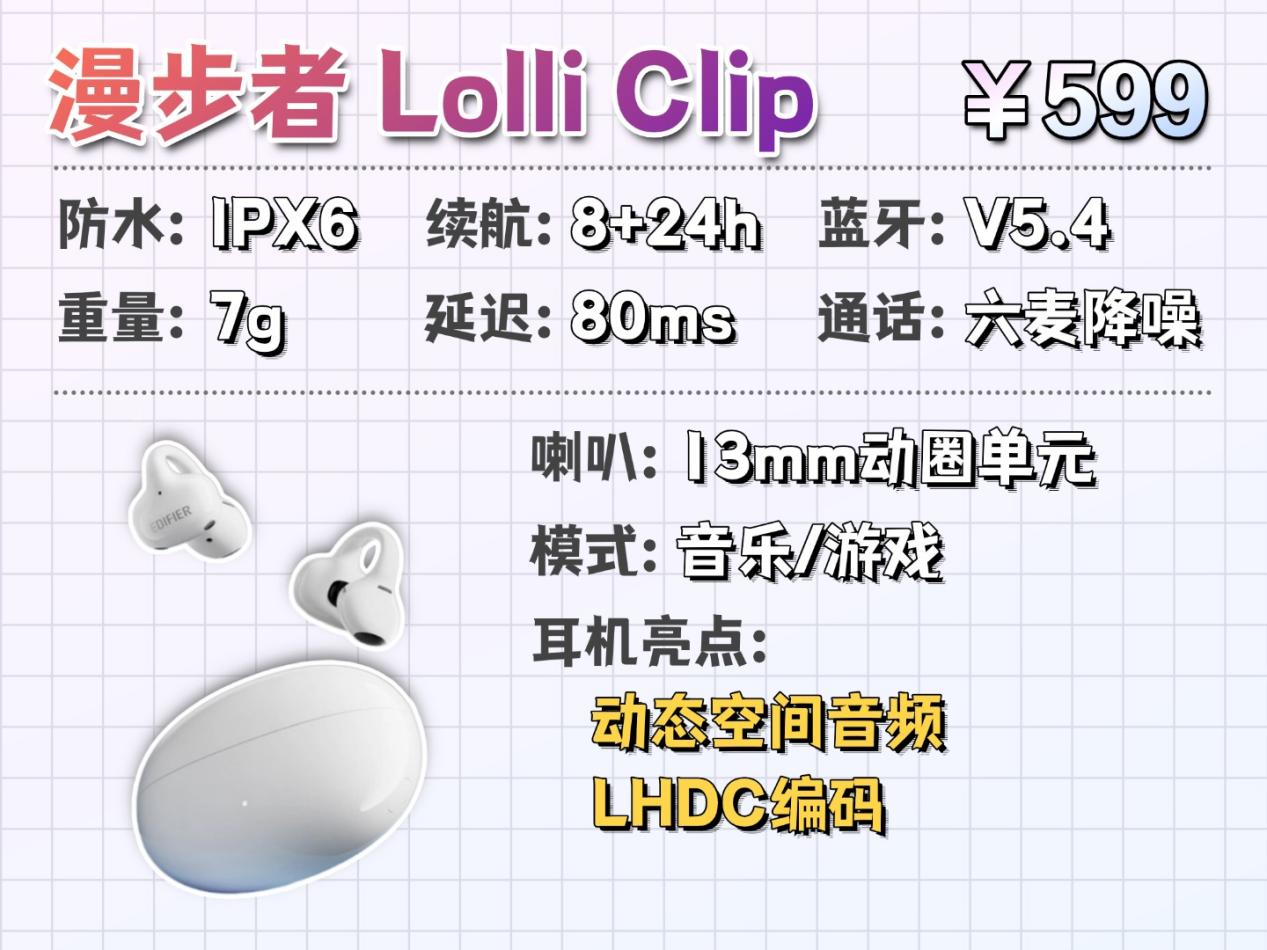 漫步者Lolli Clip在音质表现上相当出色,13mm动圈单元带来饱满立体的声音,人声清晰自然。动态空间音频技术让声场更开阔,听歌时能感受到明显的环绕感。加上LHDC高清编码,乐器细节更加丰富,整体听感均衡舒适。佩戴采用C形桥与多曲度软梁设计,7克重量在同类产品中略显分量,但贴合度良好,日常使用稳固不易滑落。性能方面具备IPX6高级防水,无惧汗水和雨水侵袭,六麦ENC通话降噪确保沟通清晰。虽然在音量较大时会漏音,但其扎实的音质表现和可靠的防水性能,让它成为注重音质用户的实用选择。