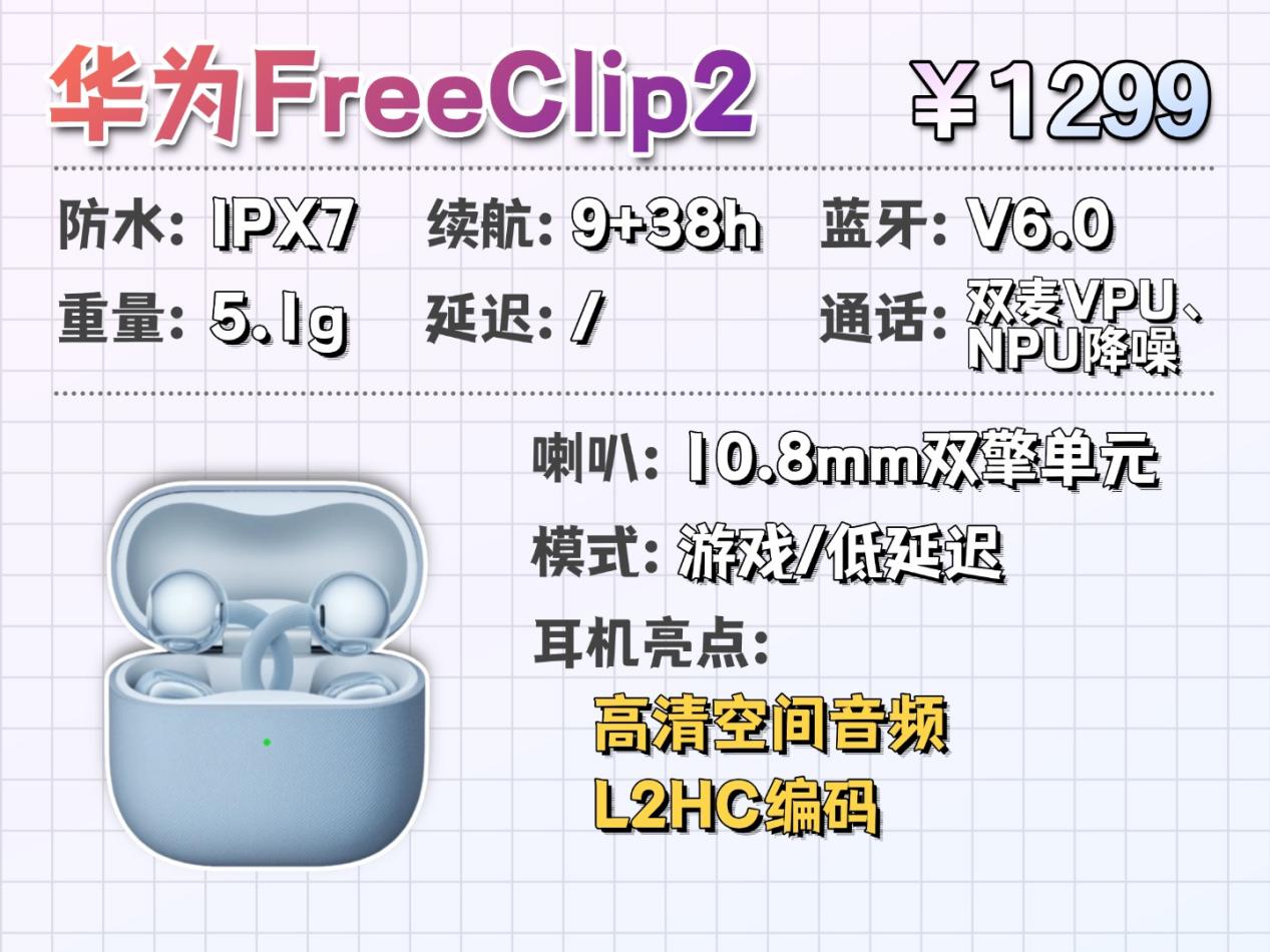 华为FreeClip在音质表现上搭载10.8mm双磁路喇叭,配合动态空间音频技术,声音饱满立体,低音扎实有深度,人声细腻通透。华为设备会有L2HC编码,能保留更多声音细节,乐器分离清晰,整体听感均衡自然。佩戴采用C形桥与人因工程设计,5.6克机身重量分布合理,长时间使用也不会产生压迫感。性能方面具备36小时总续航,四麦ENC通话降噪确保沟通清晰,支持一拖二设备切换。虽然部分高阶功能需配合华为设备使用,但其出色的音质表现和舒适的佩戴体验,特别适合华为生态用户选择。