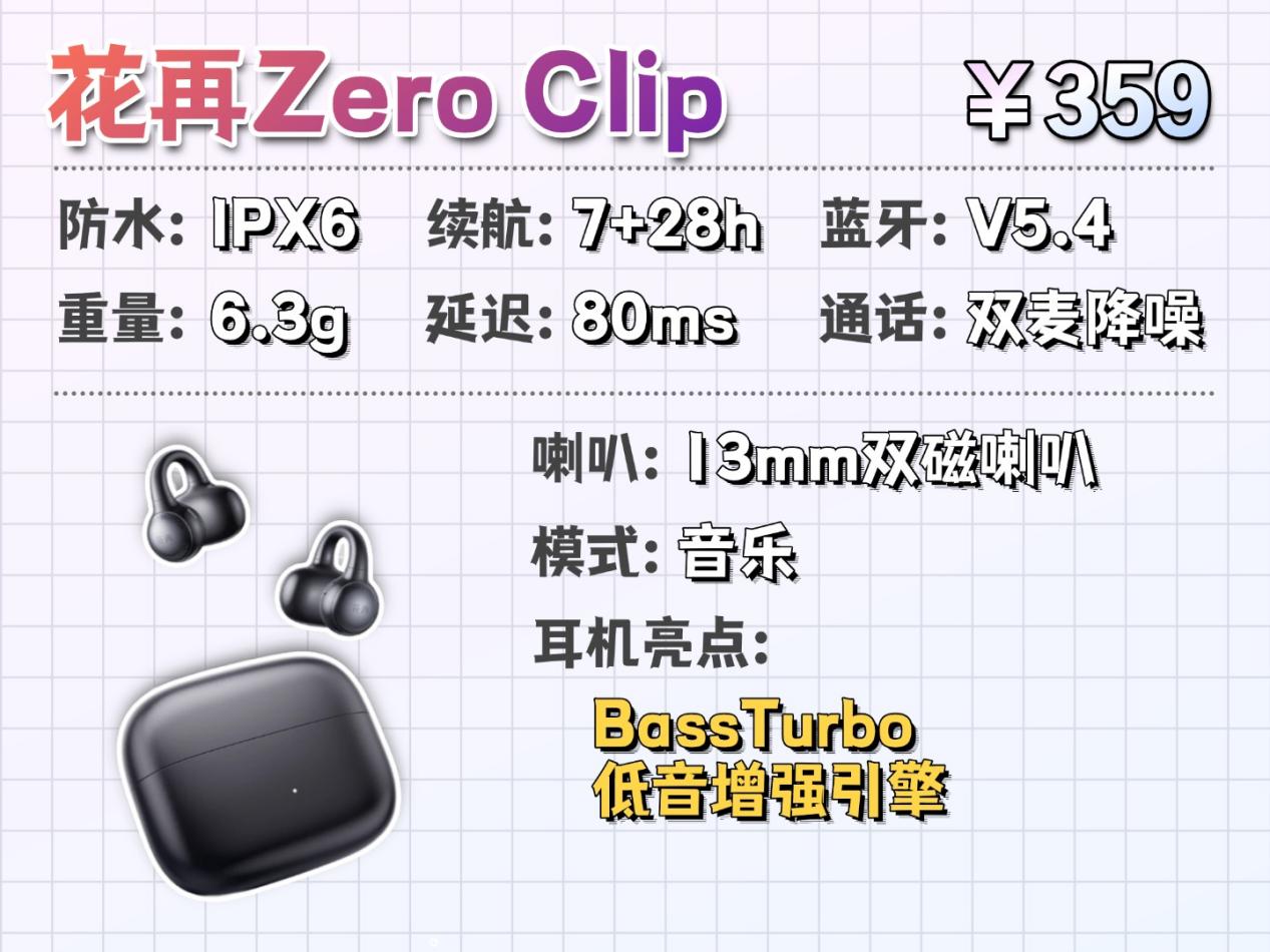 花再Zero Clip在音质表现上相当扎实,12mm钛度复合振膜配合BassTurbo低音增强引擎,低频深沉有力度,鼓点饱满不松散,人声细节清晰自然,整体声音饱满均衡。佩戴采用C形桥与12度黄金夹角设计,6.3克机身能牢固贴合耳廓,运动时不易滑落,但长时间使用会感觉到明显重量。性能方面具备IPX6高级防水,可应对雨水和汗水侵袭,28小时总续航满足日常使用,双麦ENC通话降噪确保沟通清晰。虽然存在些许漏音且续航中规中矩,但其扎实的音质和可靠的防水性能,特别适合需要防水功能的运动用户。
