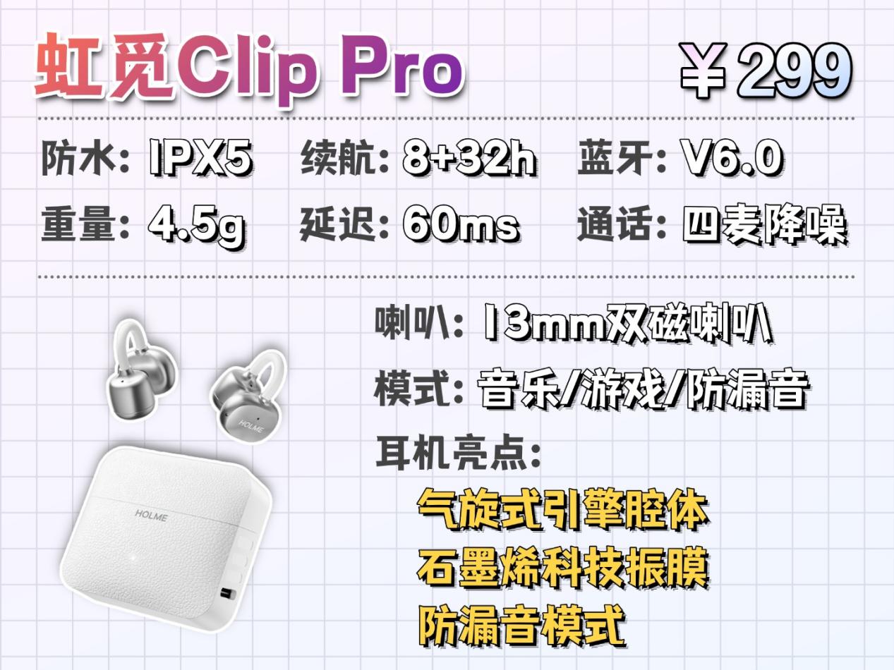 这副虹觅Clip Pro戴着特别舒服,搭载13mm双磁喇叭搭配气旋式引擎腔体,低音饱满有弹性,人声清晰自然,石墨烯振膜让细节表现更丰富,整体听感均衡耐听。同时佩戴2.5mm错位设计完美避开耳廓敏感区,12度弧面耳托贴合得刚刚好,4.5克的重量几乎感觉不到存在,长时间佩戴也不会胀痛。还有防漏音模式在公共场所特别实用,四麦ENC通话降噪确保通话清晰,蓝牙6.0连接稳定,加上32小时的续航,日常使用完全够用。总的来说,这款耳机在舒适度和实用性上都做得很到位,特别适合追求音质的同时注重佩戴体验的用户。