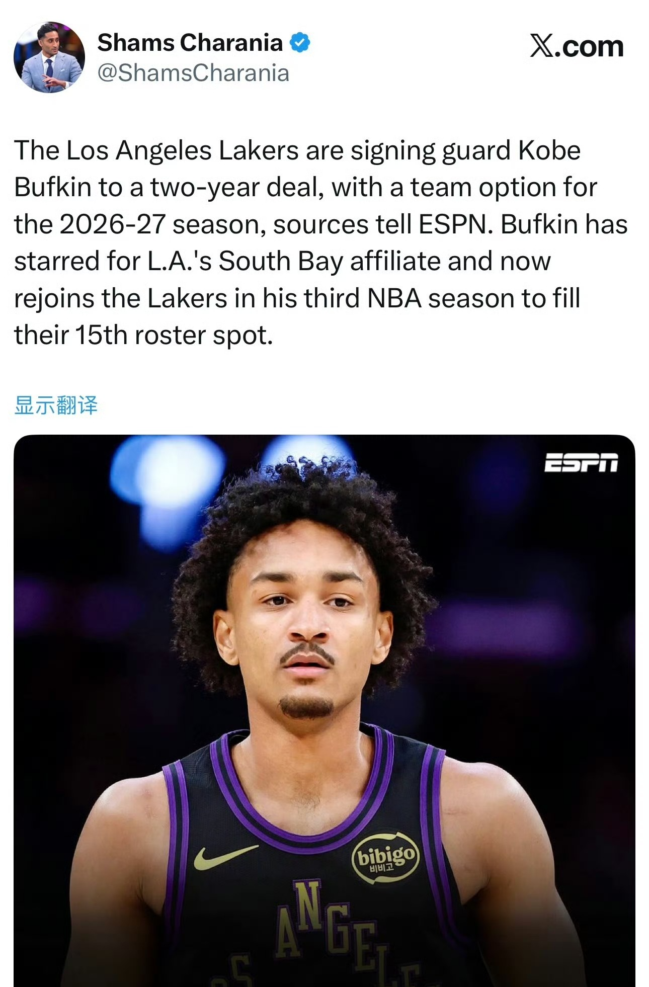 据ESPN记者沙姆斯·查拉尼亚透露,洛杉矶湖人与自由球员后卫科比·巴夫金签下了一份两年的合同,并且湖人队拥有下个赛季的球队选项。