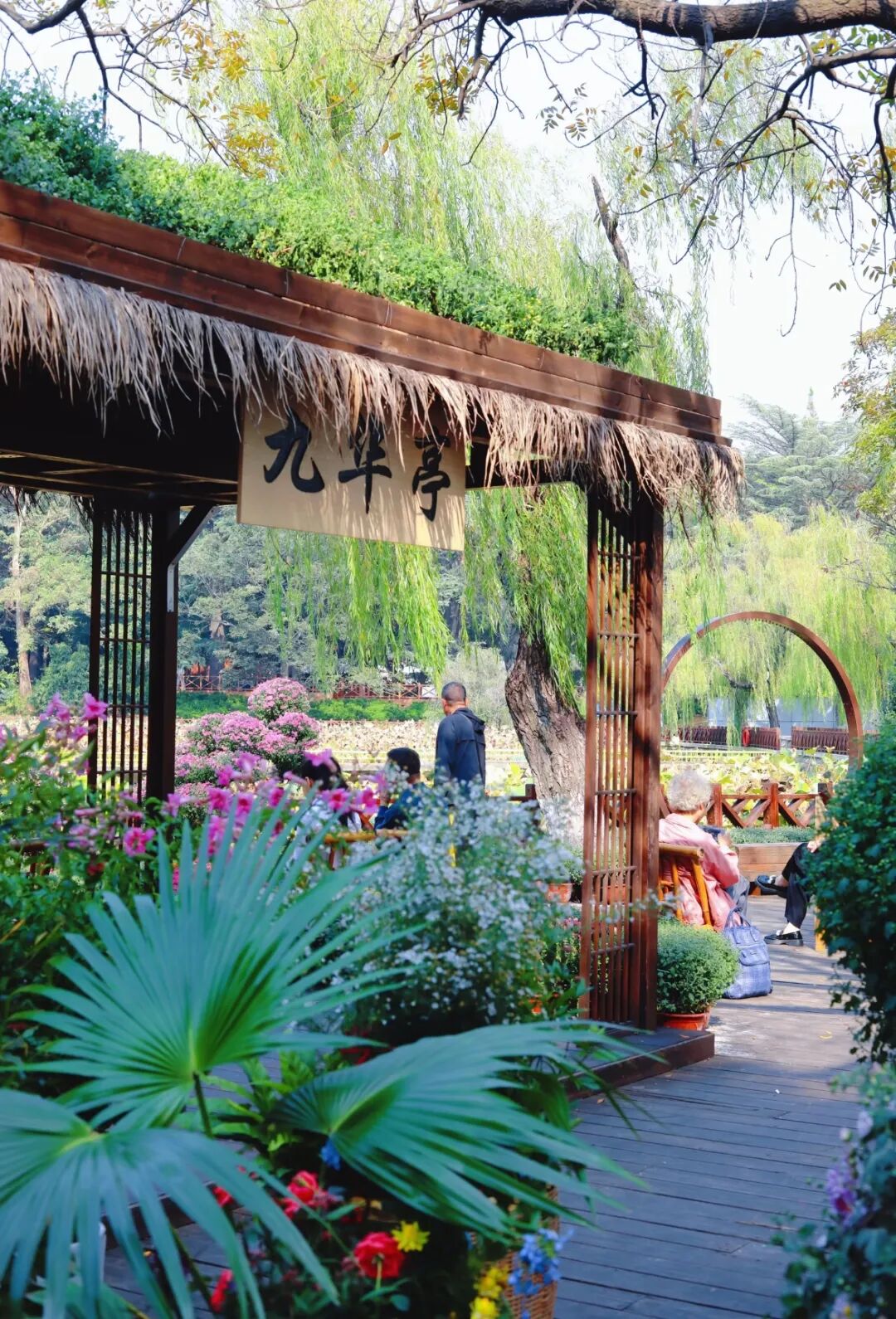小西湖边的九华亭旁,国风花景悄然绽放。千里江山图的背景、藤编灯笼与悬空团扇营造出古典意境,让人想要身着汉服,执扇入画,做一回画中人。