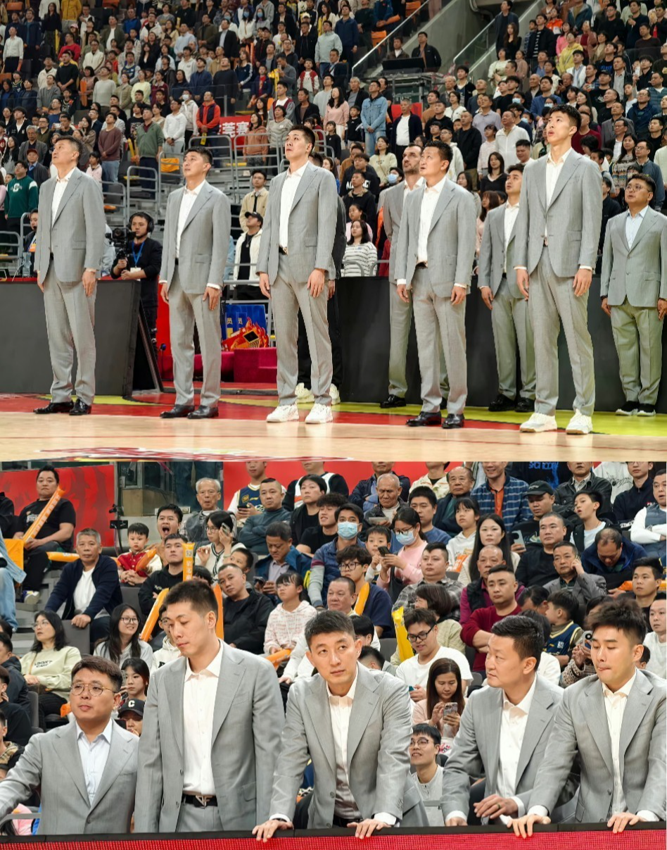 非常罕见,华南虎教练团队集体穿着同款的教练组西装亮相,从主教练杜锋,到领导魏国梁,都是如此,一身灰白西服,腰间扎的是杜锋个人品牌腰带,十分帅气。