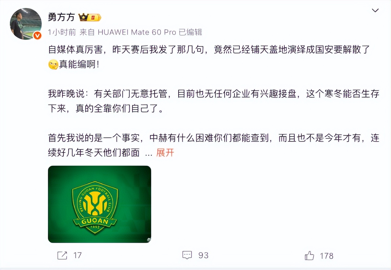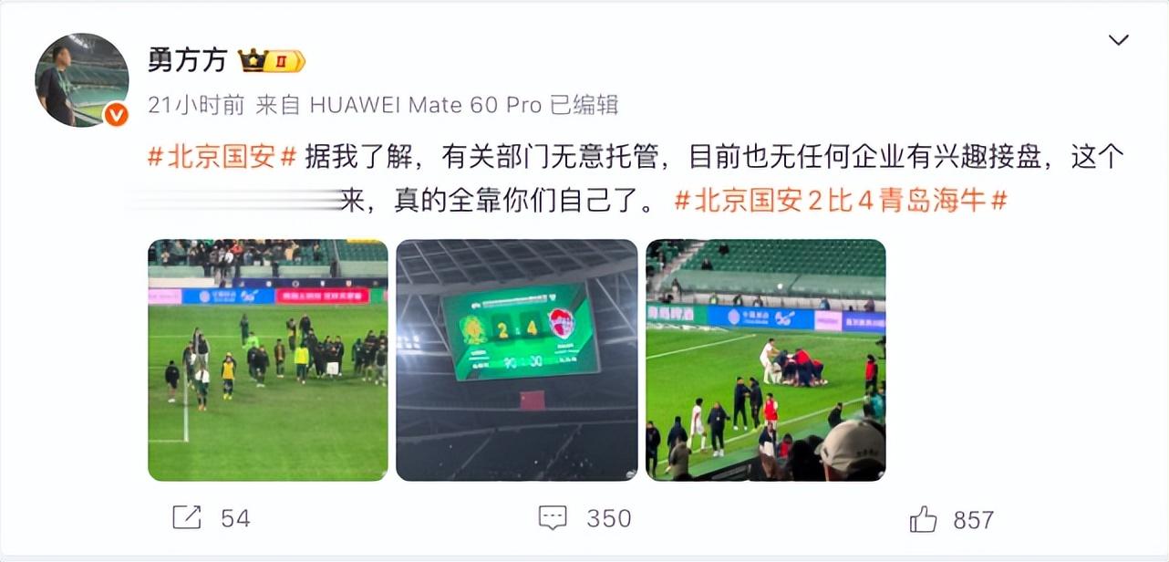 在这场比赛结束后,媒体人方勇在社交媒体上写道,“#北京国安#据我了解,有关部门无意托管,目前也无任何企业有兴趣接盘,这个寒冬能否生存下来,真的全靠你们自己了。”虽然这个状态非常正常,大部分人理解的也是希望球员能够尽快调整状态,早日找到赛季初赢球的感觉,然后靠自己去“活下去”。然而,很快这个状态就被不少人所曲解,不少自媒体对其进行解读,并且有人将这个作为北京国安将要托管甚至解散的“巨料”,并引发了不少球迷的热议。