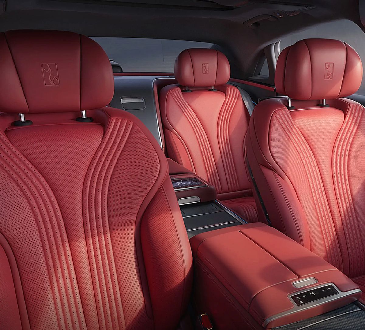 后排 “老板椅” 配备 “电动升降隔断”,座椅材质采用 Alcantara 翻毛皮 + Nappa 真皮拼接,通风、加热功率达 80W。隔断上集成 “小桌板”,车顶采用 “星空天幕”,搭配 64 色氛围灯,兼顾运动感与豪华感。
