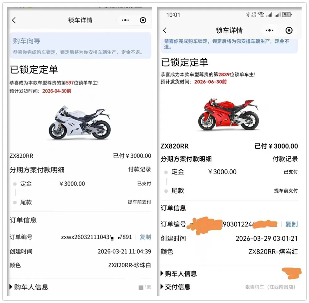 由于张雪820RR-RS夺冠,很多人一时冲动下单。我从闲鱼找了两张图,3月21日(夺冠前)下单的预计发货日期是4月内,而3月29日(夺冠后)下单的预计发货日期延长到6月,看来是订单爆表了。