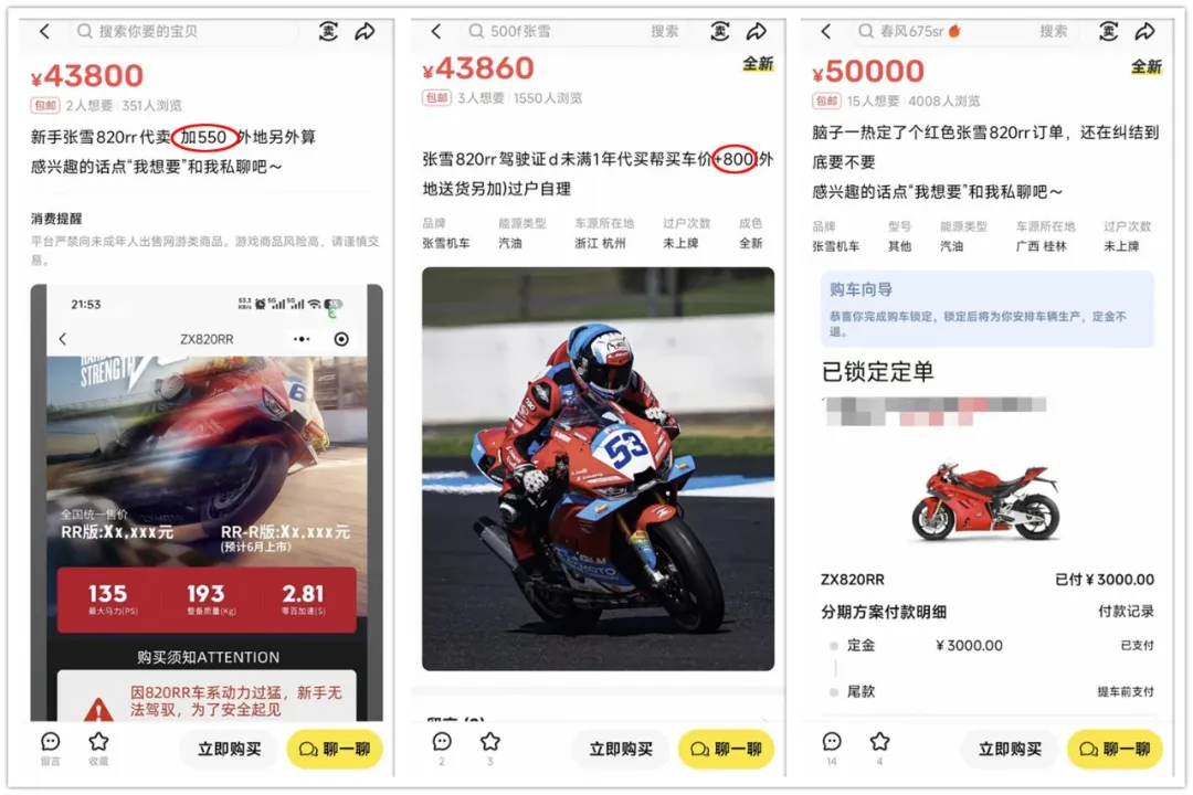 闲鱼也开始出现黄牛加价,原本43800元的张雪820RR订单普遍加价几百到几千,这还是订单加价,如果谁手里真有现货的话,那估计就是坐地起价了。