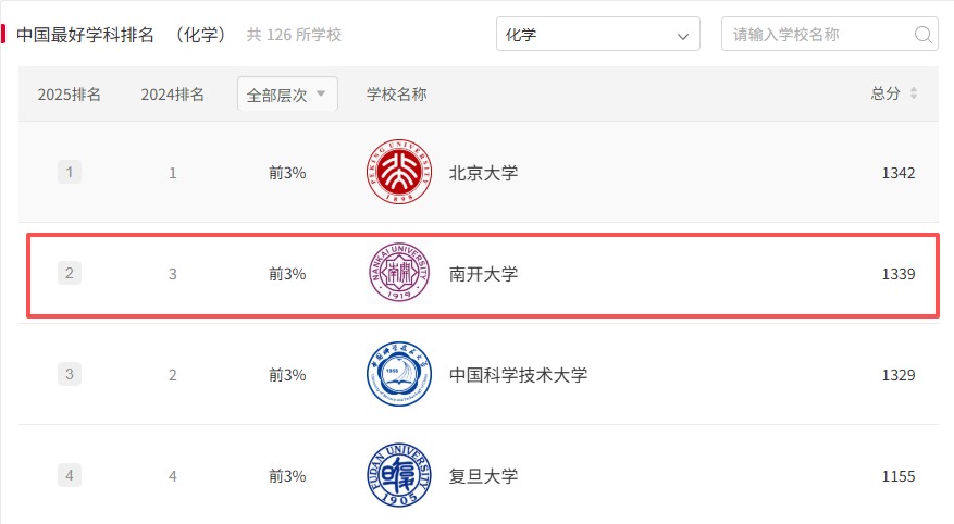 今天,就把目光投向南开大学。提起它的化学,行内人往往会心一笑:那是真正的“王牌”。在2025年软科中国大学学科排名中,南开化学稳居全国第二,仅次于北京大学;更值得一提的是,其学科实力已跻身全球前万分之一,达到了世界顶尖水准。数字背后,是实打实的硬核支撑。