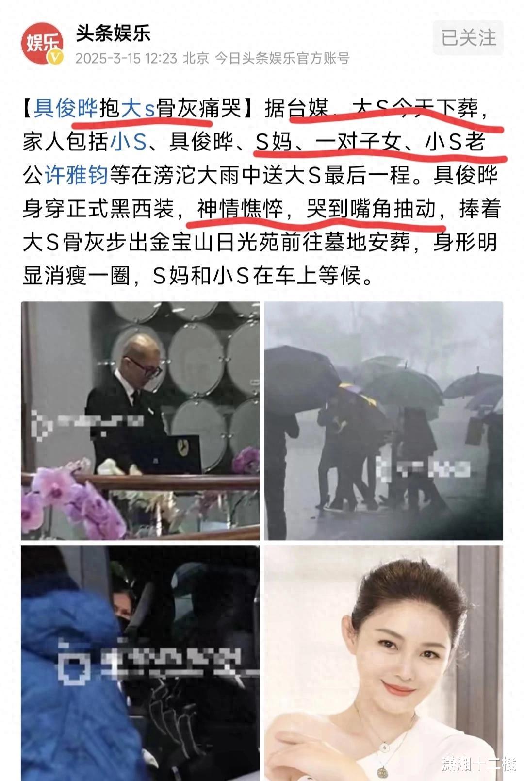 可是作为前夫的汪小菲并没有到场,徐家人、具俊晔与汪小菲之间的闹剧,估计也会伴随着大S的下葬,也已经结束了。