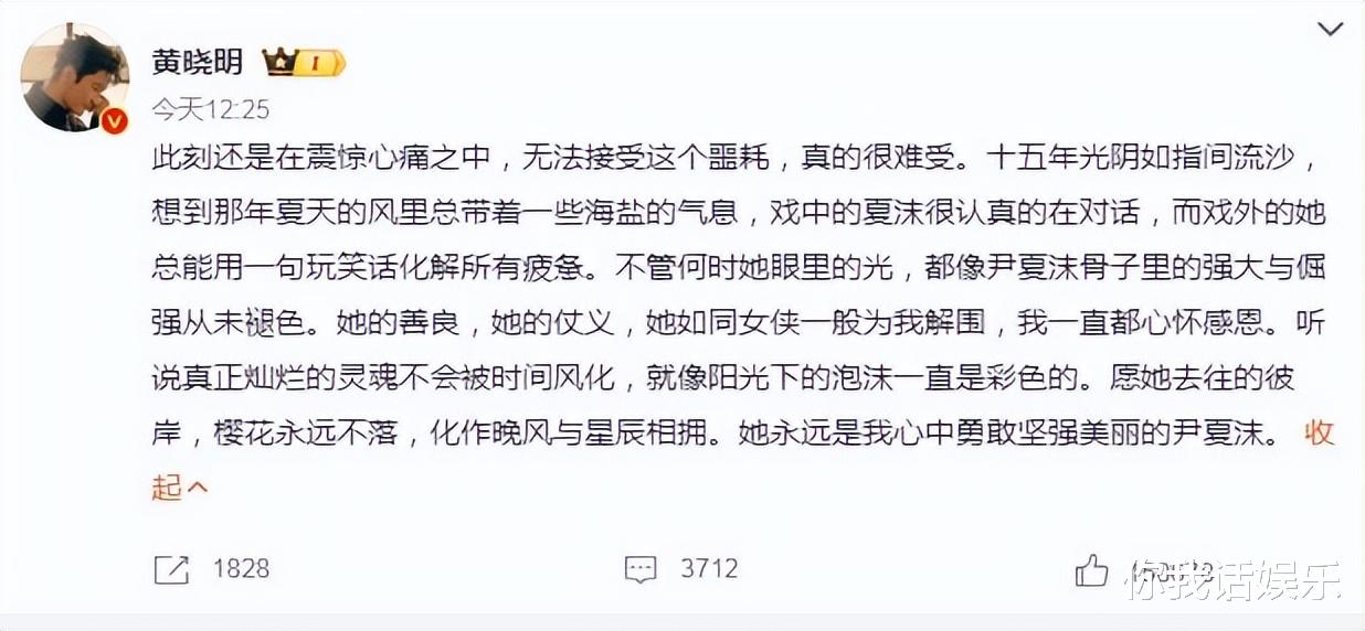 黄晓明在发文中提及,无法接受这个噩耗,真的很难受。
