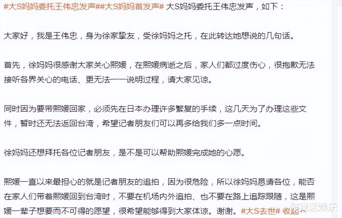第二大重点,徐妈妈还想拜托各位记者朋友,帮助熙媛完成她的心愿:希望记者朋友不要在机场内外追拍、也不要在路上追踪跟随大S的家人。