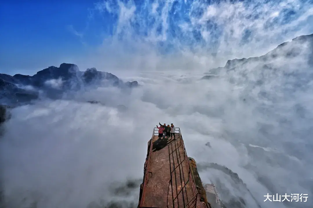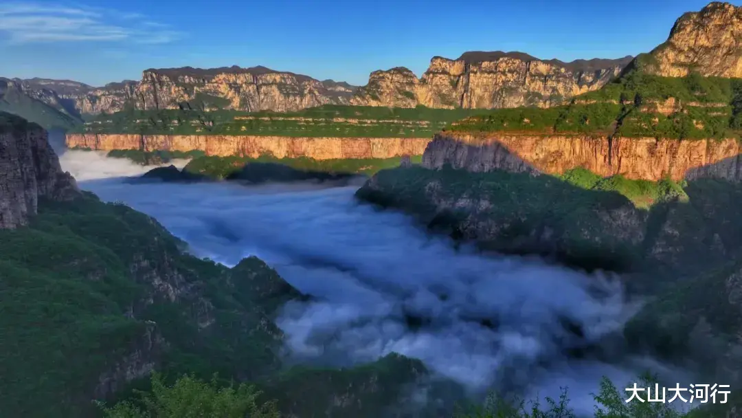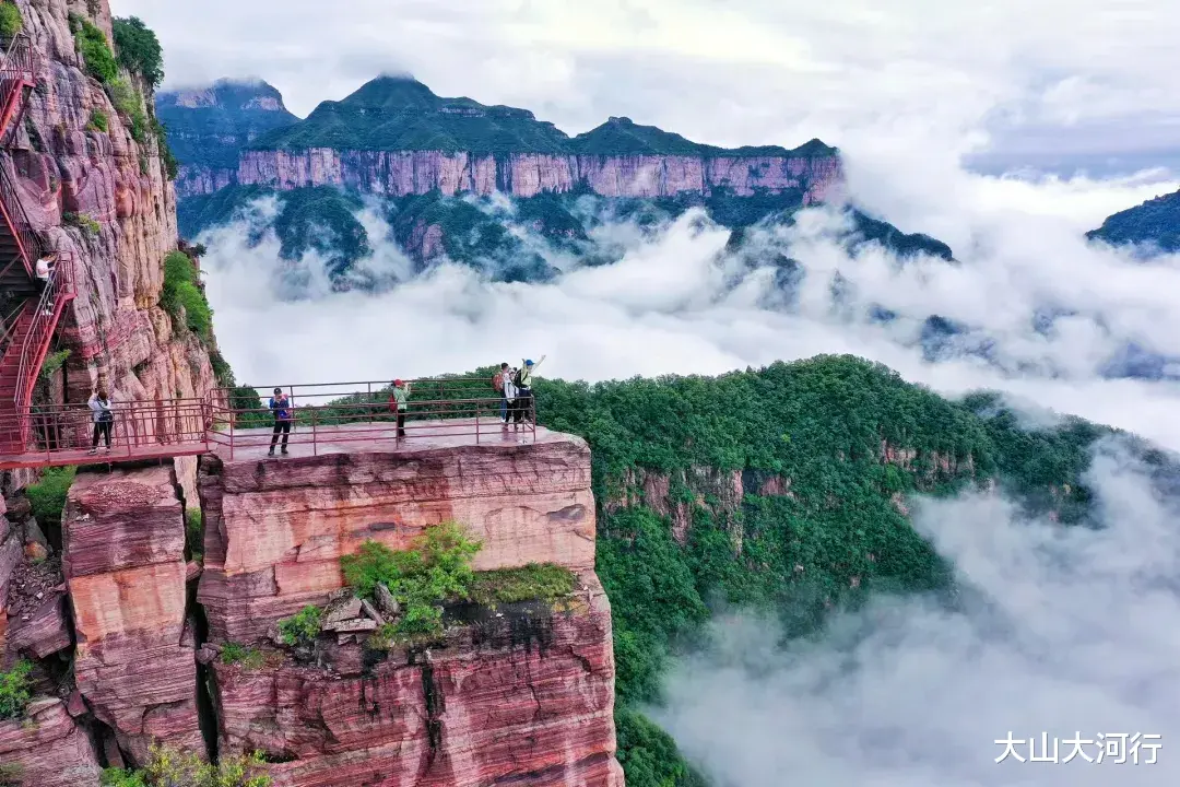 如果你想把太行全景看个够,那就去云峰画廊。这条观景道绕着山建,站在任何一个观景台上,眼前都是不一样的风景。早上来的话,能看见云海从山谷里冒出来,把远处的山遮得只剩个影子,阳光一照,云海里还会有金色的光,像仙境一样;等太阳升高了,云雾散了,就能看到“百里红岩”的壮观——一大片红色的山岩连在一起,像条巨龙趴在地上,还有“佛卧太行”的奇景,连绵的山形看起来就像一尊睡着的大佛,鼻子、眼睛都清清楚楚,让人忍不住感叹:这大自然也太会“雕刻”了!