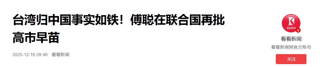 中国常驻联合国代表傅聪当场批评日本首相高市早苗的涉台言论违反联合国宪章,也挑战战后国际秩序。