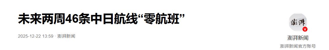 2025 年 12 月 23 日至 2026 年 1 月 4 日,46 条中日支线航线全部取消,共 2195 班次,取消率达 40.4%,涉及 38 座机场,影响超44万人次。