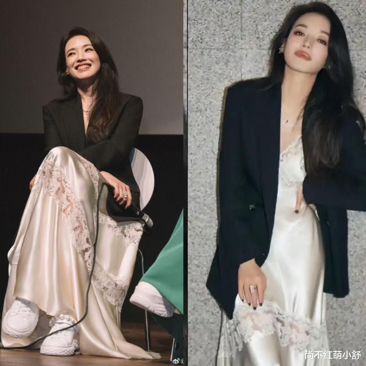 今年蕾丝流行偷偷美,告别大面积透视蕾丝!像领口蕾丝边、袖口镂空、后背小设计,精致又不夸张,连通勤都能穿。瞧舒淇这套蕾丝吊带裙裙+西装外套的搭配就很时髦,蕾丝若隐若现,网友们直呼“这才是高级性感”。