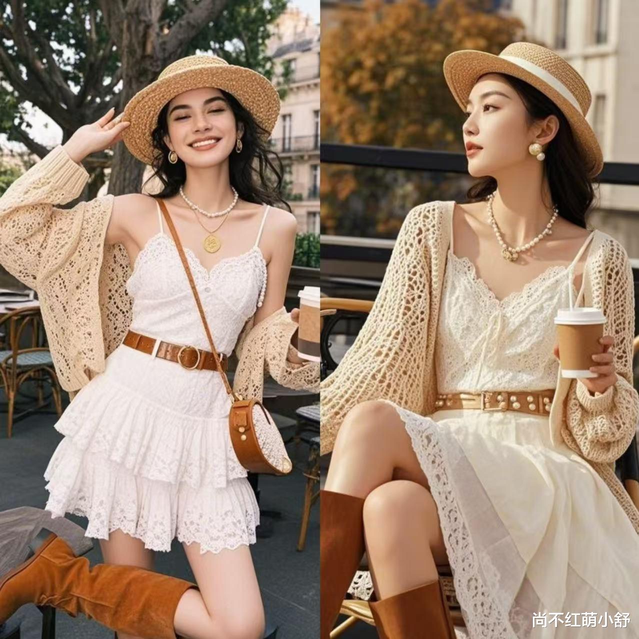 look2、白色的蕾丝吊带+燕麦色针织开衫+靴子:开衫扣子解开,蕾丝裙露出来,搭配腰带,纯欲感直接拉满。