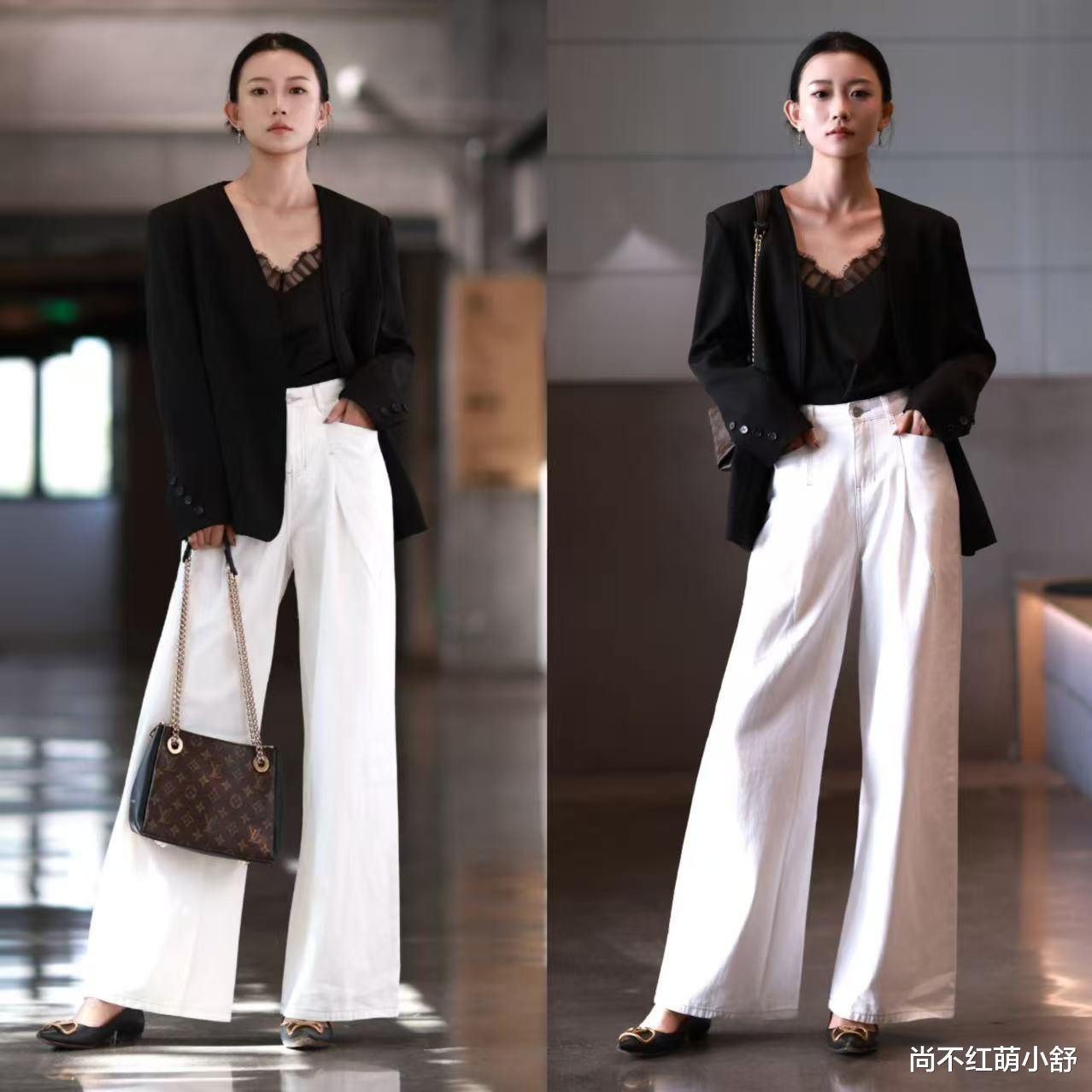 look1、黑色蕾丝内搭+白色西装裤+黑色西装外套:注意蕾丝仅领口,最好是蕾丝领口露出1cm,温柔又专业,搭配盘发,妥妥的职场通勤风。