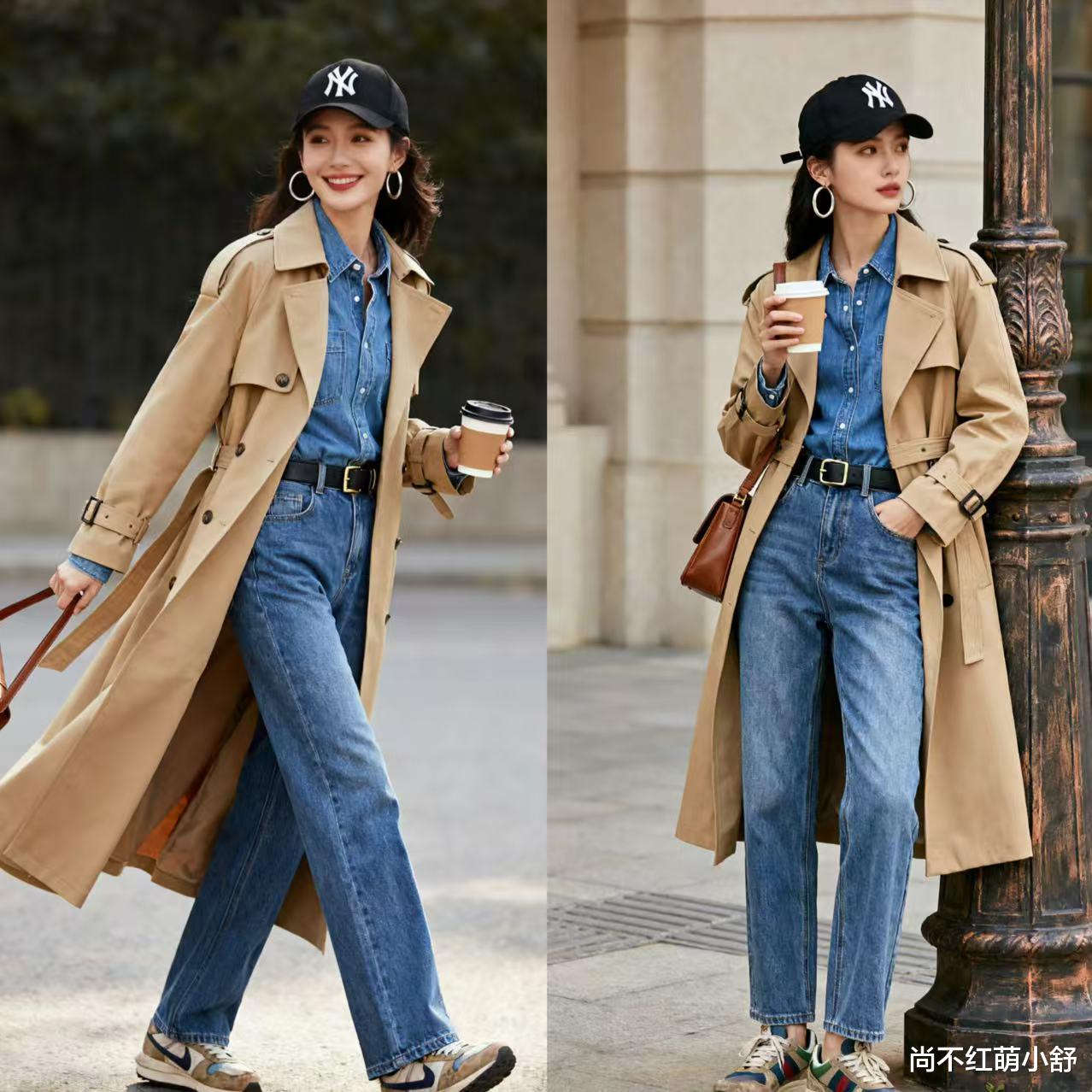 look2、牛仔陈述毛衬衫+咖色风衣:衬衫领口袖口各露出2cm,层次感拉满,配牛仔裤温柔到骨子里,再加上棒球帽+运动鞋的休闲,整体慵懒极了。