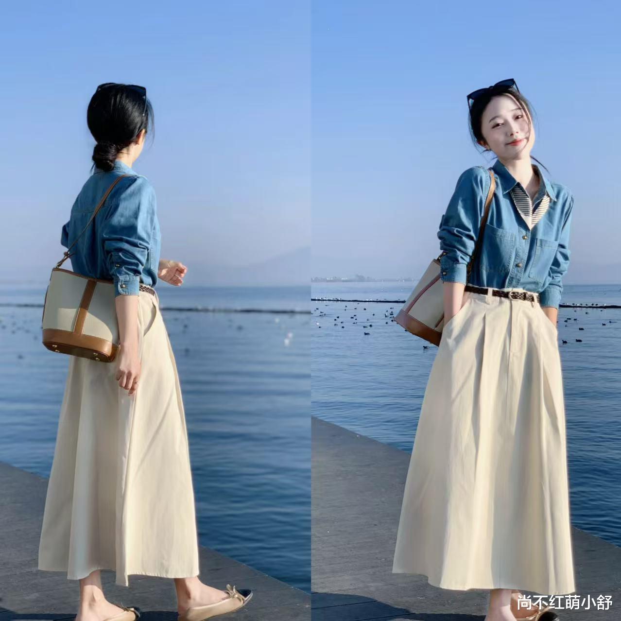 look1、宽松款款式的浅蓝牛仔衬衫+白色半身裙:衬衫下摆塞在下装里,采用腰带塑造出好比比例,露出腰线,配浅口单鞋,青春活力满满,真的好减龄啊~