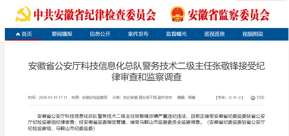 然其久居要津,渐忘初心。以技术之专,掩谋私之实;借评审之权,行寻租之便。台上高谈标准公正,台下暗搞利益输送;手中执掌“数字盾牌”,心下盘算“黄金通道”。所谓“专家型腐败”,其行愈隐,其害愈烈。丙午年三月初十日(2026年3月10日),安徽省纪委监委驻省公安厅纪检监察组公告:张敬锋涉嫌严重违纪违法,接受纪律审查;经省监委指定,由马鞍山市监察委员会监察调查。一世警途,半生荣光,终因贪念,尽付东流。