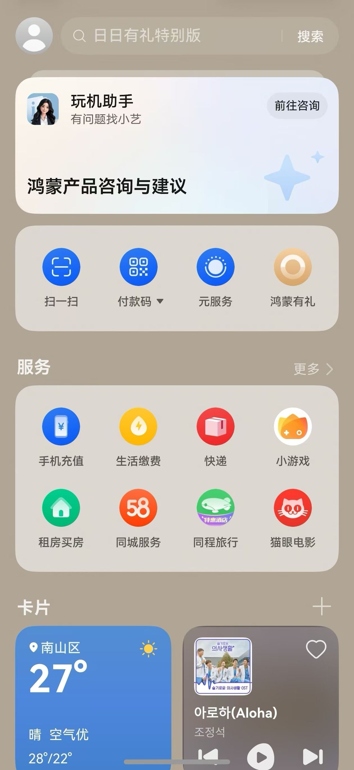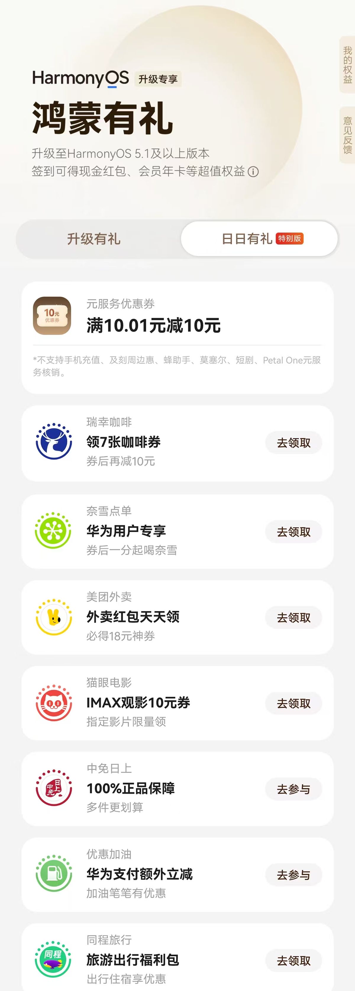 其实最开始我也觉得这些功能可能都不是刚需,但用习惯后,真香定律果然发生在了我的身上,我承认我的生活因为它们变得更简单了。喜欢宅家的听我一句劝,把常用功能和服务都安排在负一屏上,你一定也会爱上的。对了,双十一当天在鸿蒙有礼的”日日有礼特别版“还可以领取价值10元的元服务优惠满减券,满10.01元就可以用了!在美团、瑞幸、奈雪等元服务上都能用,想领的家人们把系统升级到鸿蒙操作系统5.1及以上,就可以薅一波羊毛,可别错过啦!