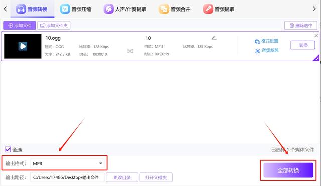 步骤3:ogg文件导入完成后,请确认左下角的输出格式为MP3,确认无误后请点击全部转换按钮,点击就可以启动ogg转MP3程序。