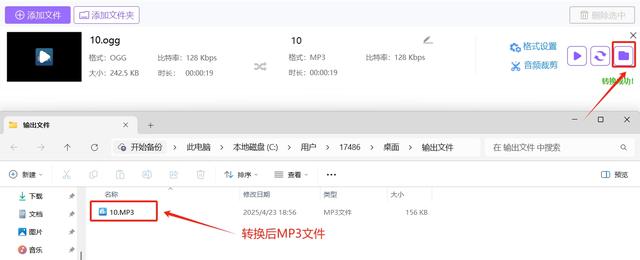 步骤4:软件完成转换后,你只需要点击文件右侧的文件夹图标就可以打开软件的输出目录,此时你就可以顺利找到转换好的MP3文件。