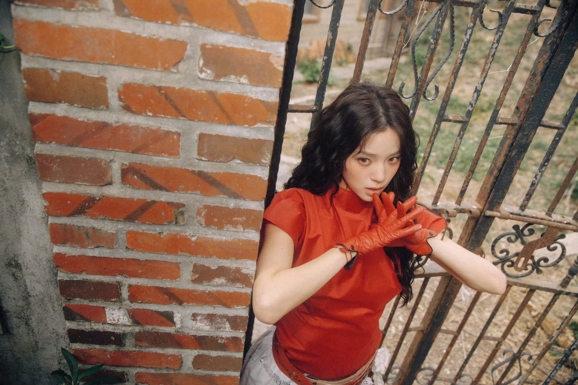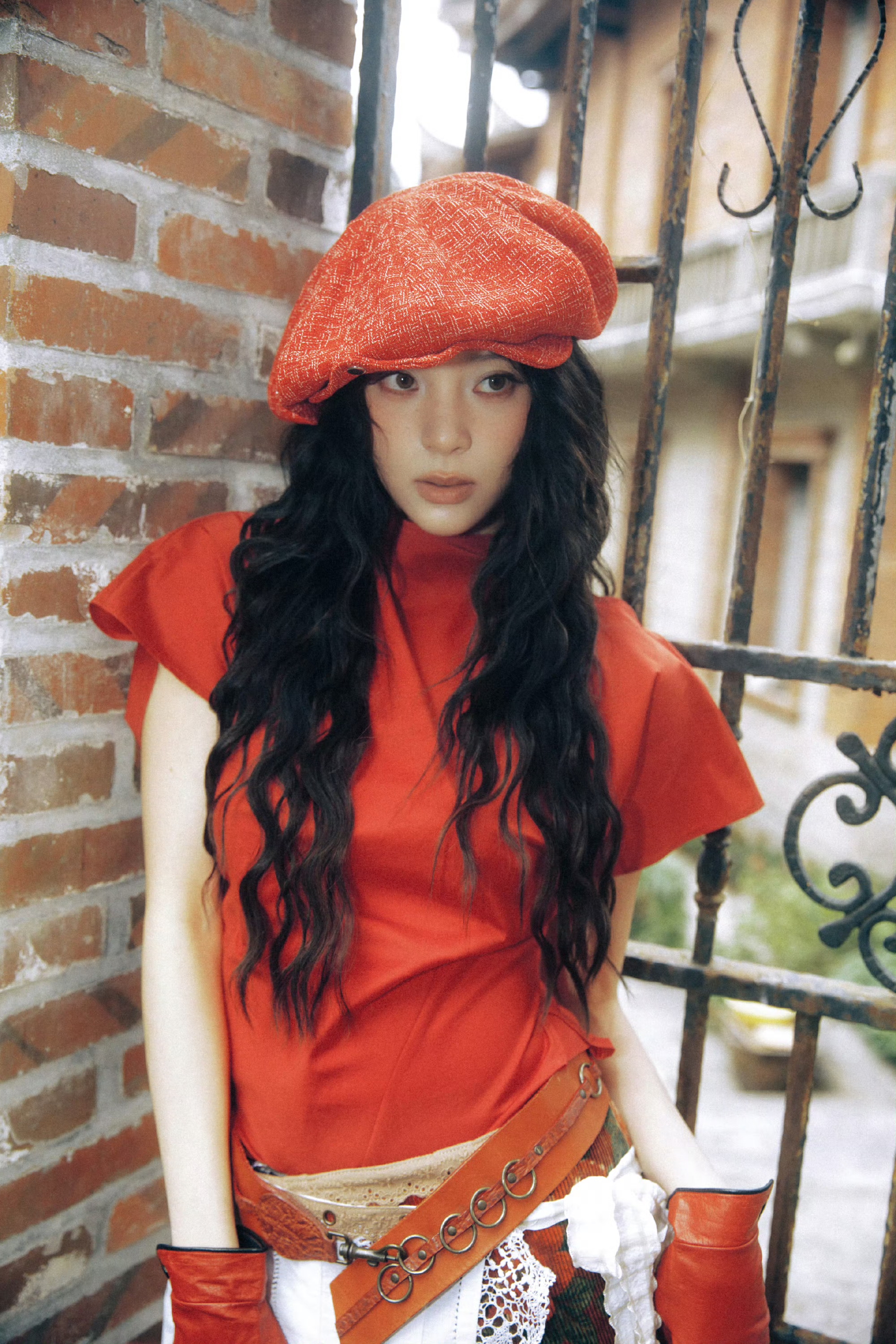 棕色皮带收束腰线,同色系手套与软底鞋相呼应,在胶片质感的光影里,像从旧时光里走出的文艺少女。她以松弛姿态驾驭混搭风格,将复古港风与东方庭院的氛围感完美融合。