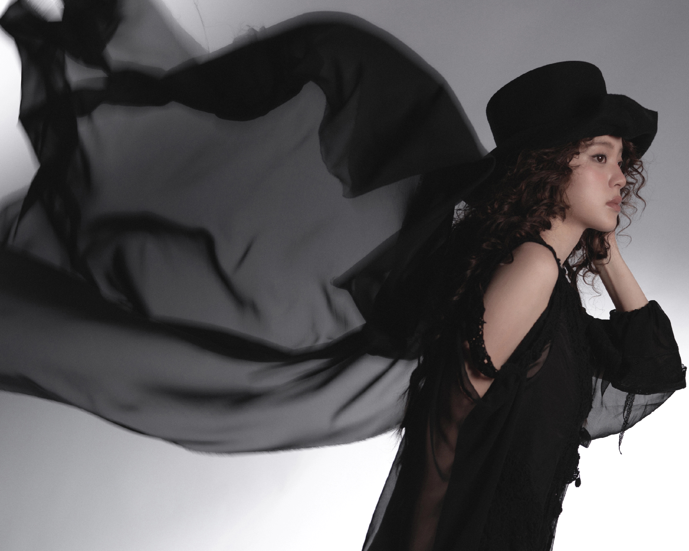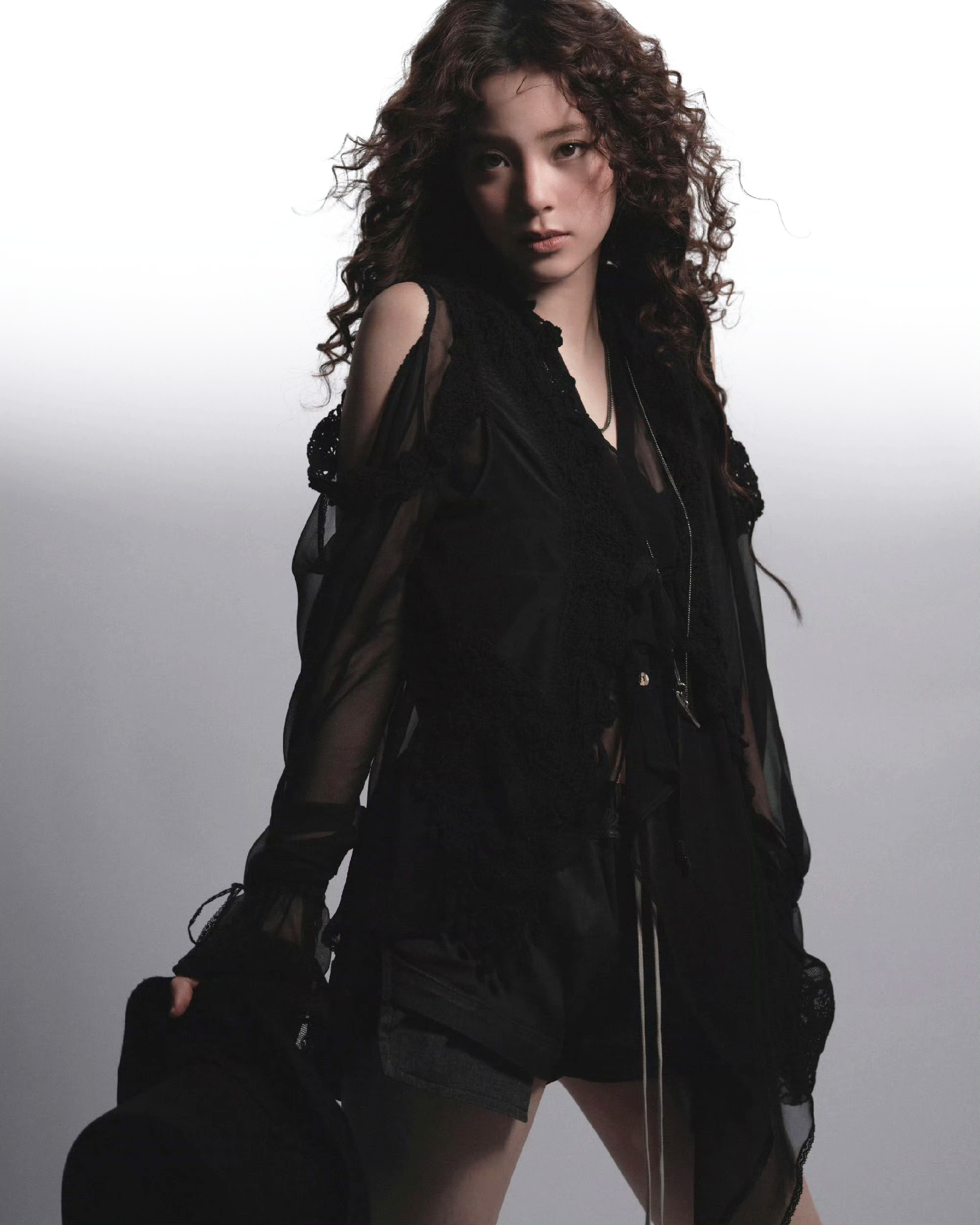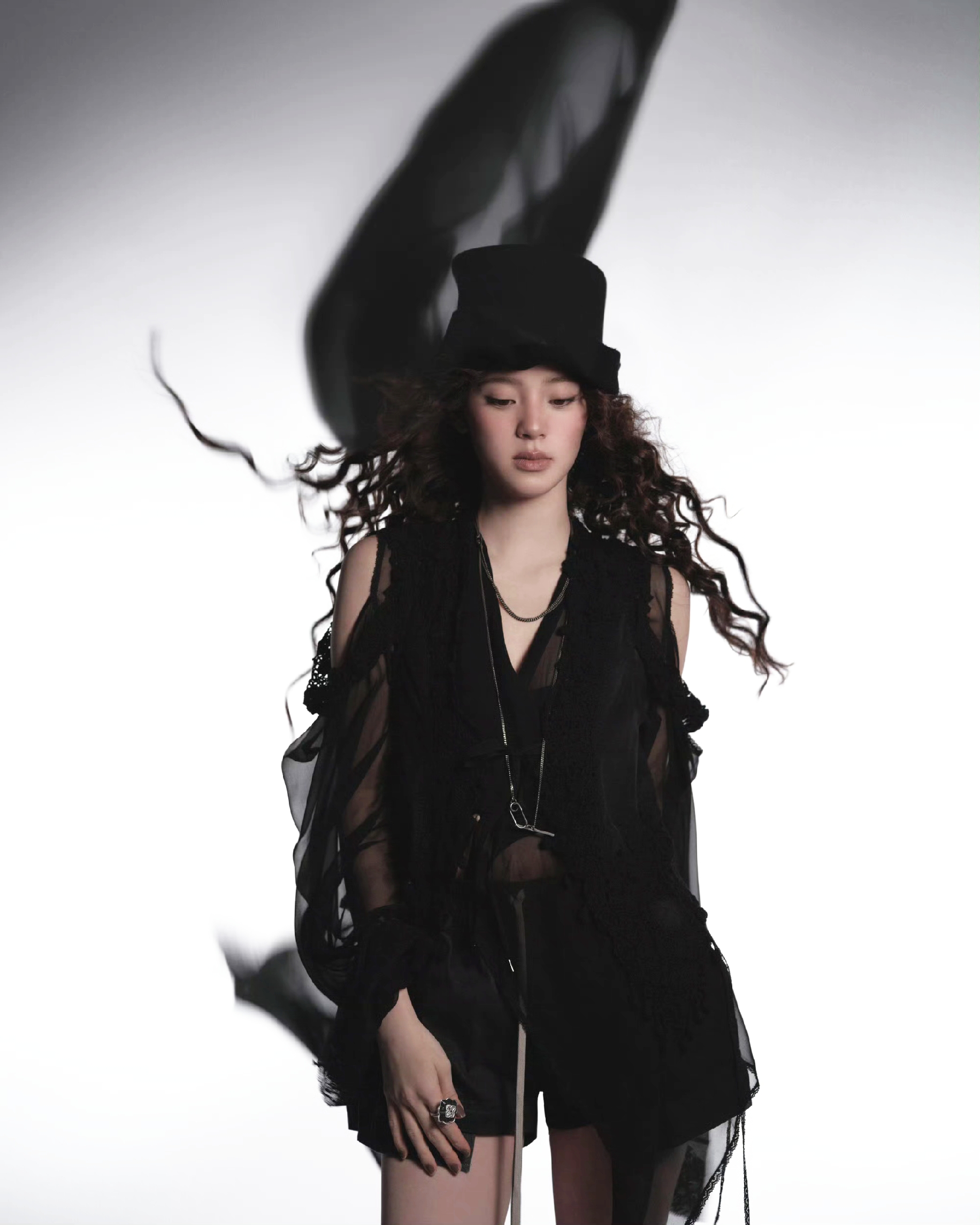 一身黑纱穿搭尽显清冷高级,瞬间切换到暗黑艺术风。透视黑纱与蕾丝元素交织缠绕,薄纱的朦胧感描摹出身体轮廓,蕾丝的精致肌理为暗黑风格添了一丝柔媚。