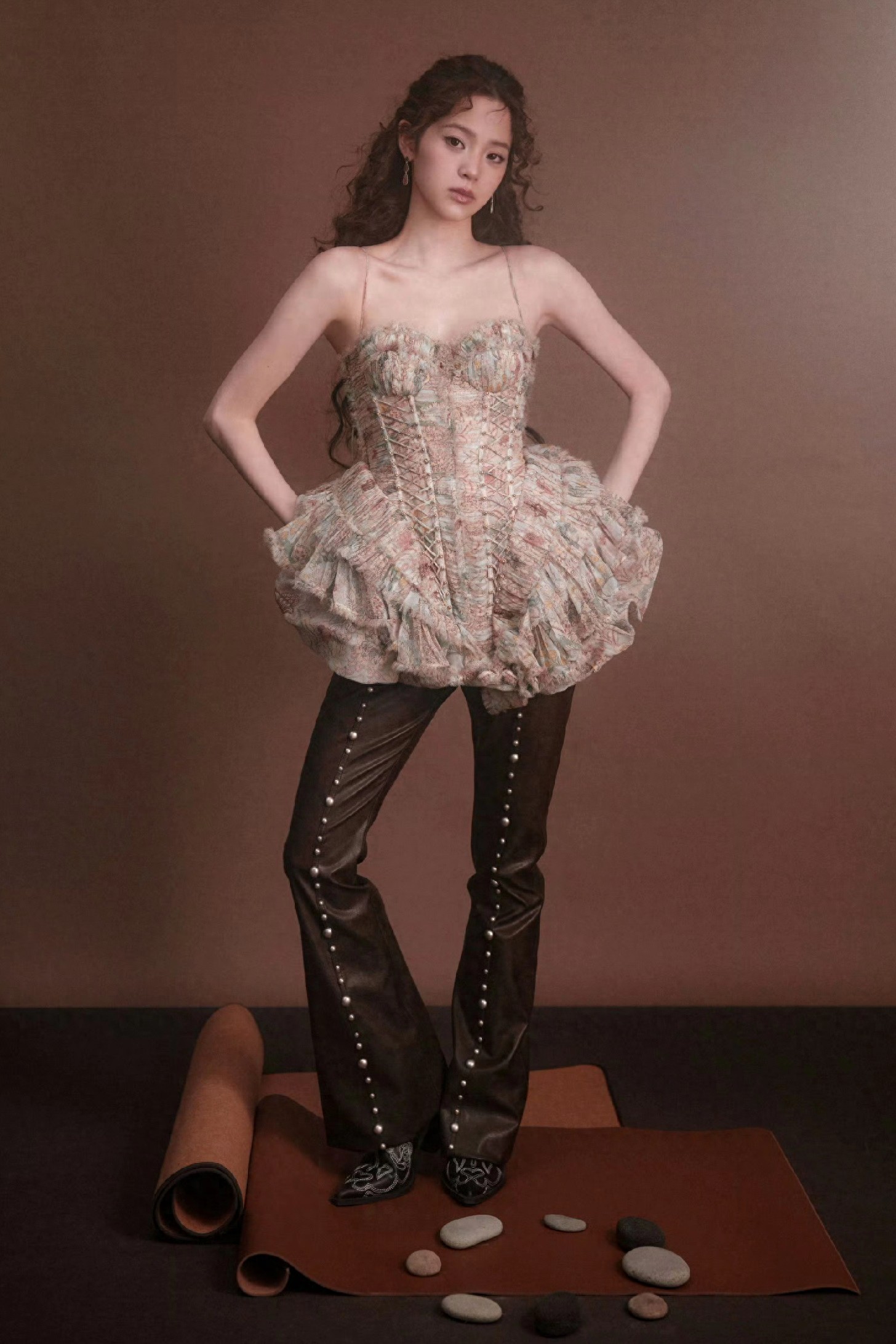 欧阳娜娜身穿复古束腰蓬裙,搭配铆钉皮裤,甜酷碰撞间尽显巧思。碎花束腰勾勒出纤细腰线,蓬起的裙摆藏着少女的浪漫,而利落的皮裤与铆钉又注入了不羁的力量感。