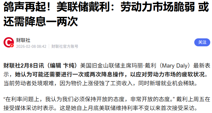 戴利表示,降息还需要 “真正担心劳动力市场状况比当前数据显示的更为严峻”。美国去年 12 月失业率为4.4%。媒体调查的经济学家预计,美国劳工部下周公布的最新非农就业数据将显示,1月失业率维持不变。她表示,如果企业发现预期需求未能实现,劳动力市场中解雇现象可能开始增多,但鉴于通胀预期保持稳定,她并不认为通胀会大幅升温。新一波的预期管理又开始了,对面只要跌一点,马上就开始了……